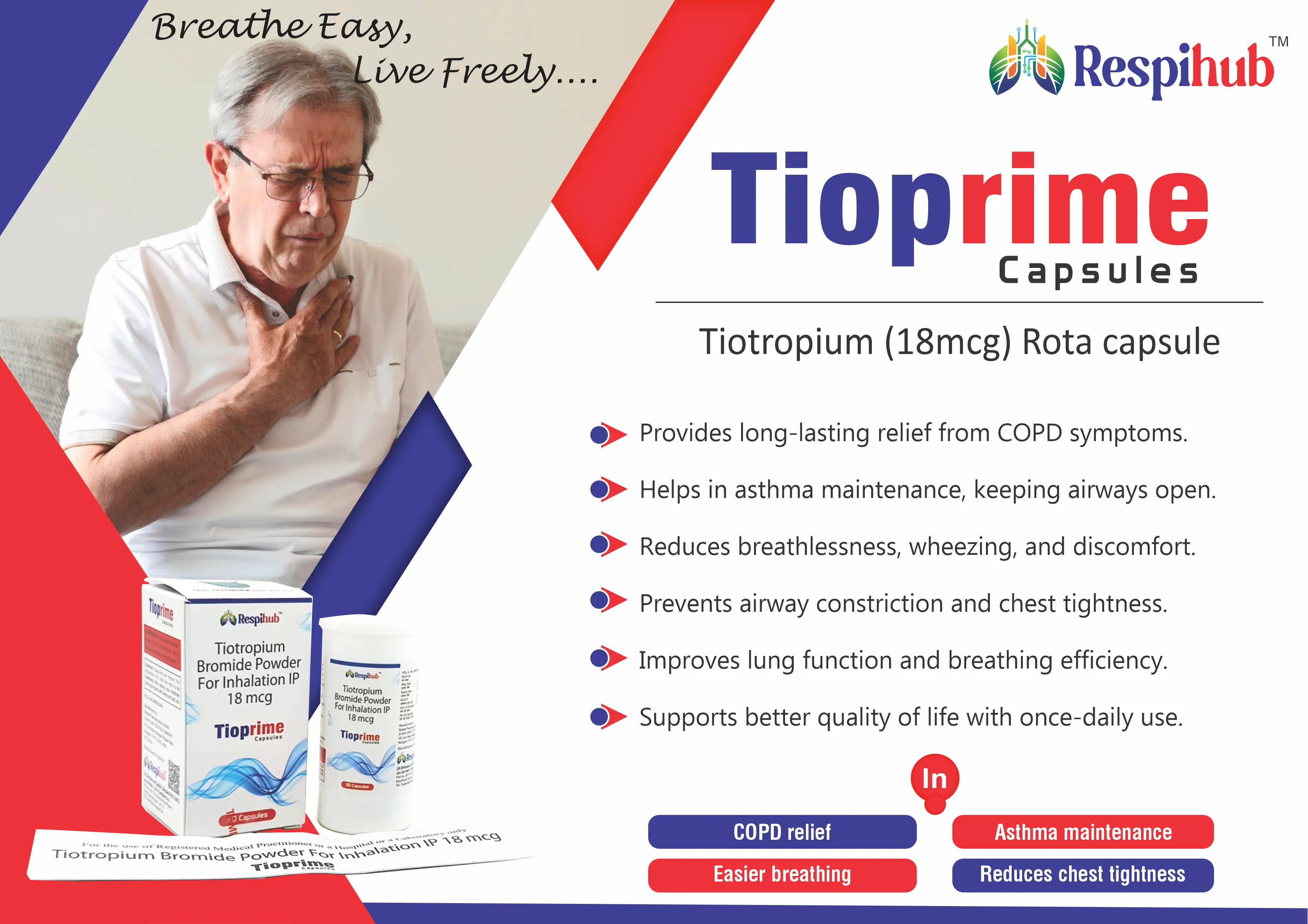 Tioprime dry powder inhaler capsules is a specialized inhalation medication containing Tiotropium (18 mcg) designed for the long-term management of chronic obstructive pulmonary disease (COPD) and asthma. As a long-acting anticholinergic bronchodilator, Tiotropium works by inhibiting the action of acetylcholine on muscarinic receptors in the airways, leading to relaxation of the bronchial muscles and improved airflow. This mechanism helps to alleviate symptoms such as wheezing, shortness of breath, and chest tightness, allowing patients to breathe more easily and engage in daily activities with greater comfort.