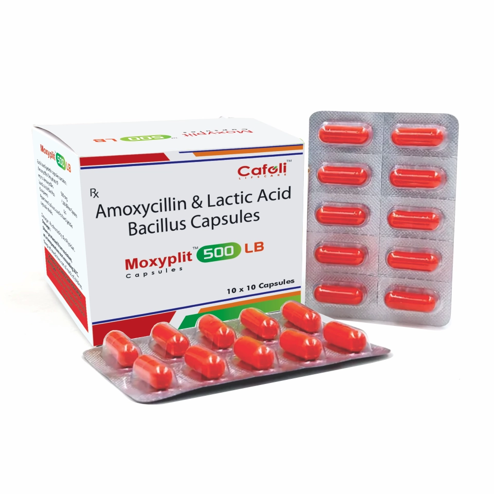Moxyplit 500 LB Capsule is a combination medication designed to combat bacterial infections effectively while maintaining gut health. It contains Amoxycillin, a broad-spectrum antibiotic from the penicillin group, which works by inhibiting the bacterial cell wall synthesis, leading to bacterial destruction. To address the common side effect of antibiotics disrupting gut flora, Lactic Acid Bacillus is included. This beneficial probiotic restores the natural balance of intestinal bacteria, preventing antibiotic-associated diarrhea and supporting digestive health.