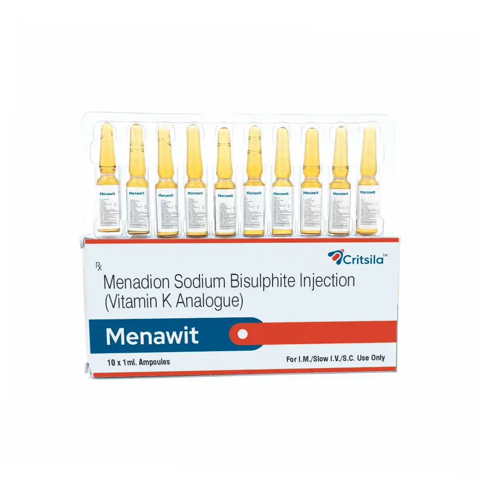 Menawit Injection contains Menadione Sodium Bisulfite (1mg), a synthetic form of Vitamin K used to prevent or treat Vitamin K deficiency and its related complications. Vitamin K plays a crucial role in blood clotting by helping the body produce clotting factors, which are essential for proper coagulation and prevention of excessive bleeding.