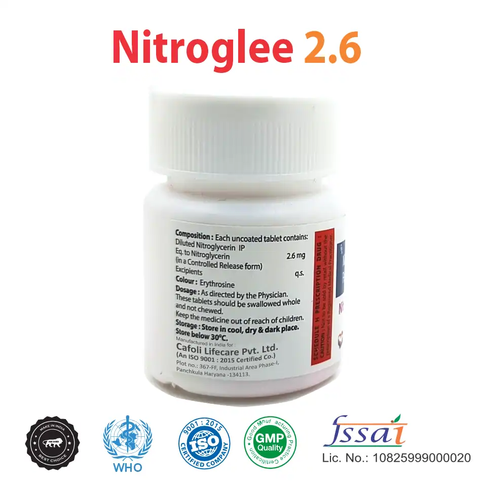 Nitroglee 2.6 Tablet contains Nitroglycerine 2.6 mg, a vasodilator used primarily in the management of angina pectoris (chest pain). It works by relaxing and widening blood vessels, allowing more oxygen-rich blood to flow to the heart muscle, thereby reducing its workload and relieving chest discomfort. This medication belongs to the nitrate class and is widely used for both the prevention and relief of angina attacks in patients with coronary artery disease.