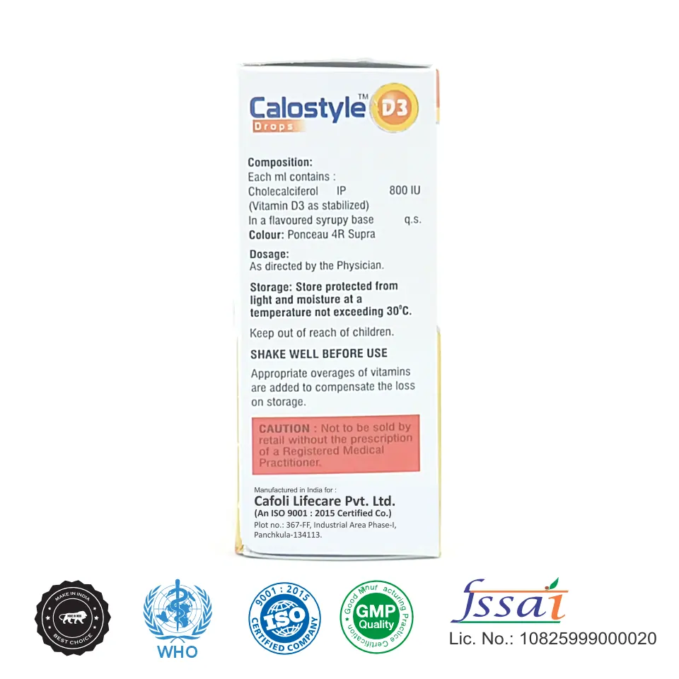 Calostyle D3 Drops are indicated for the prevention and treatment of Vitamin D deficiency, rickets, delayed bone growth, and inadequate calcium absorption in infants, children, and adults as advised by a physician.