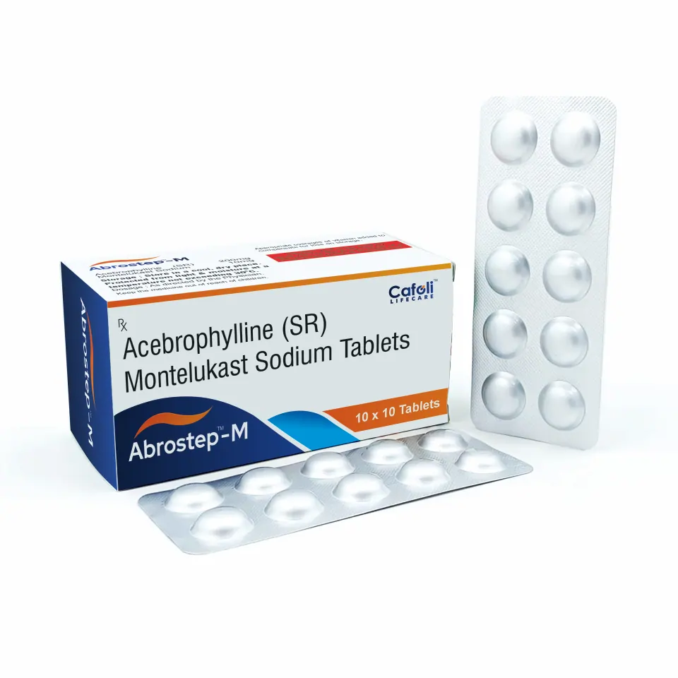 Abrostep M Tablet is a powerful respiratory formulation containing Acebrophylline (200 mg) and Montelukast (10 mg). This combination delivers a synergistic bronchodilator and anti-inflammatory effect, providing effective relief in asthma, bronchitis, and chronic obstructive pulmonary disease (COPD).