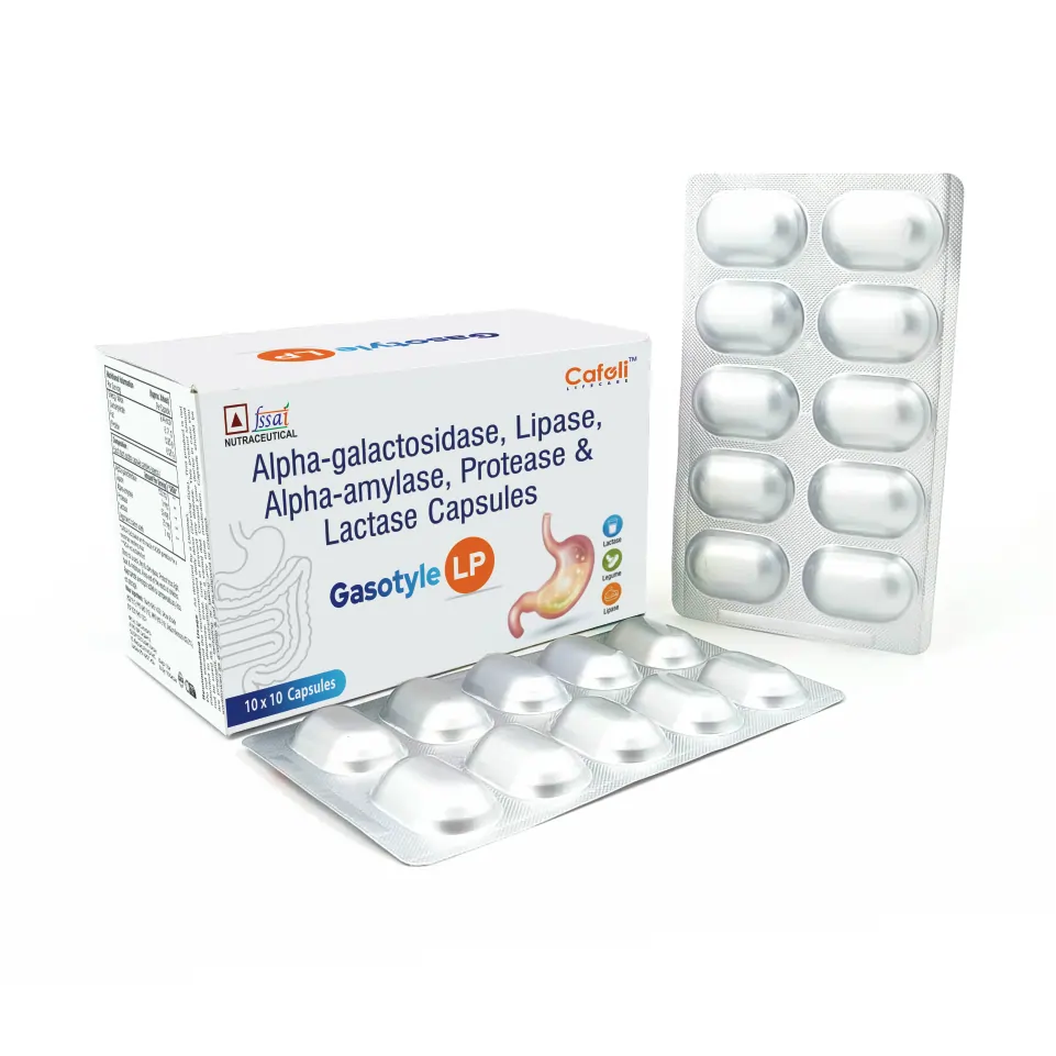 Gasotyle LP Capsule is an advanced, comprehensive digestive enzyme formulation designed to tackle the root causes of indigestion, bloating, and food intolerances by efficiently breaking down all major macronutrients. The core strength of Gastyle LP lies in its specialized components: Alpha Galactosidase (150 mg), which breaks down complex oligosaccharides found in gas-producing foods like beans, lentils, and vegetables, and Lactase (30 mg), which is critical for digesting lactose (dairy sugar). Supplemented by the full-spectrum blend of Protease (25 mg) for proteins, Amylase (50 mg) for starches, and Lipase (3 mg) for fats, this formula ensures maximal food breakdown, minimizing the indigestible residues that lead to fermentation, gas production, and gastrointestinal discomfort.