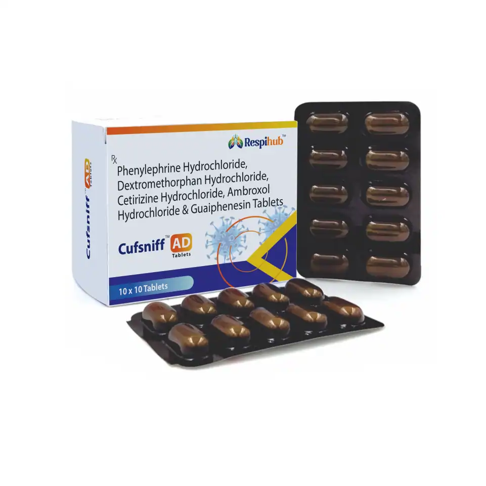 Cufsniff AD Tablet is indicated for managing symptoms of common cold, allergic rhinitis, bronchitis, and respiratory tract infections that involve cough, nasal congestion, and mucus build-up.