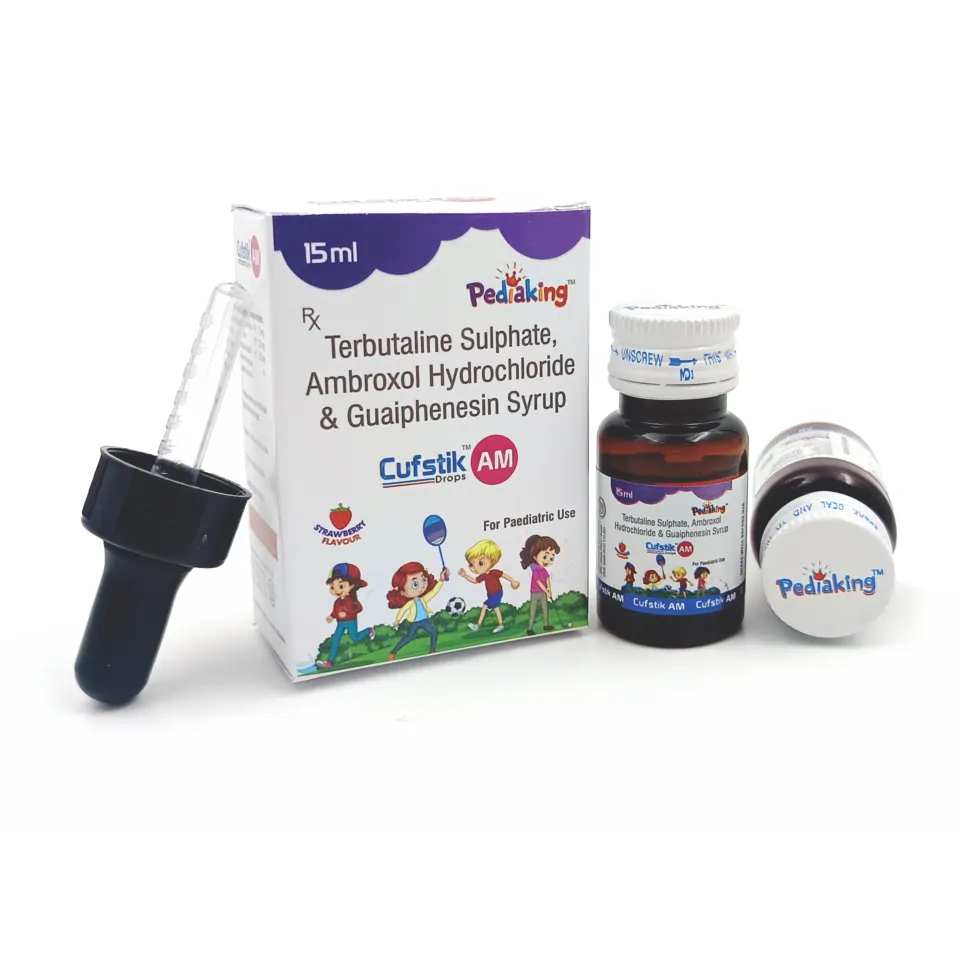 Cufstik AM Drop contains Ambroxol 7.5mg + Guaifenesin 12.5mg + Terbutaline 0.25mg, a combination used for relieving cough, loosening mucus, and easing bronchial spasms. It is effective in improving airway clearance and reducing respiratory discomfort.