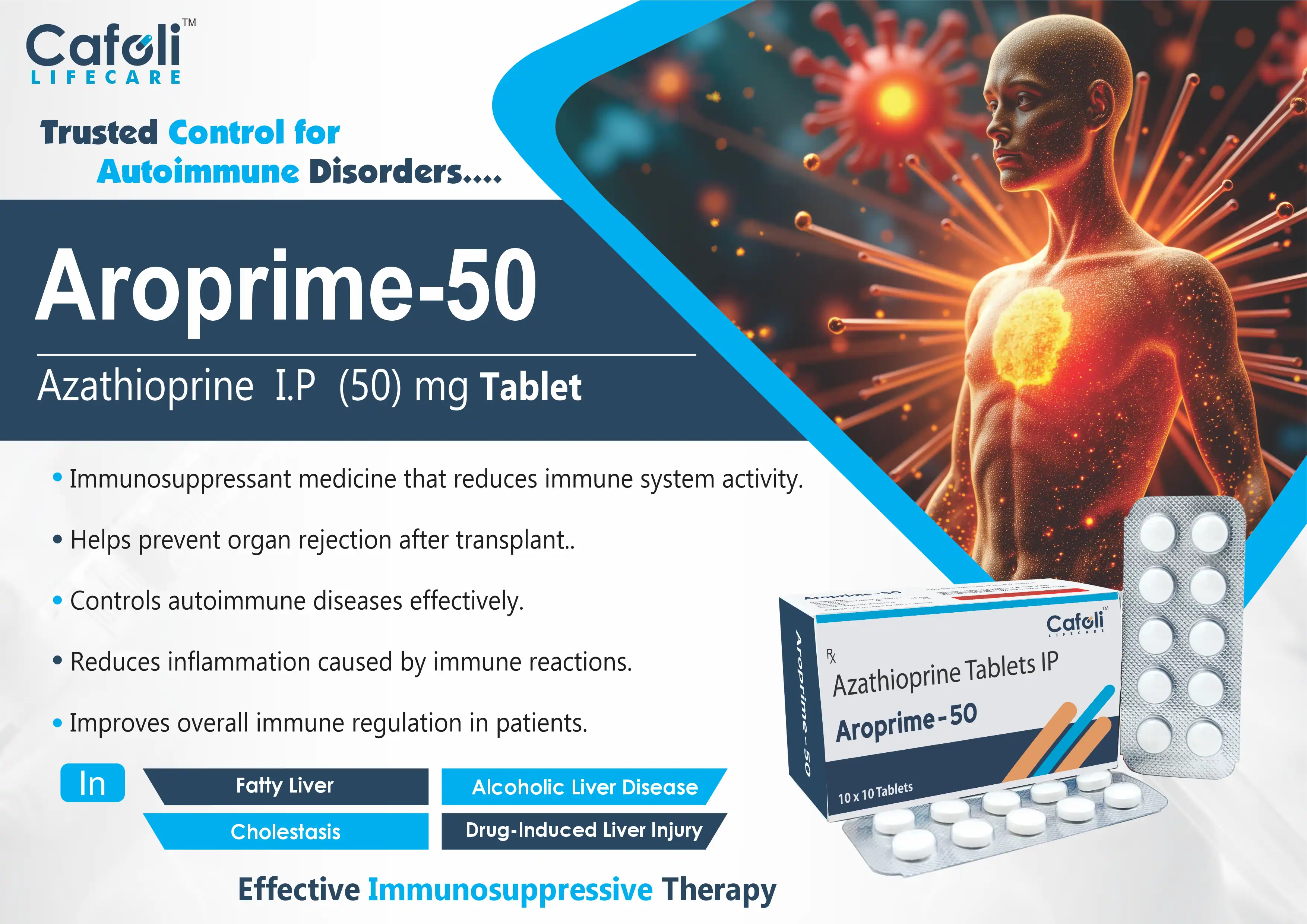 Aroprime Tablet contains Azathioprine (50mg), an immunosuppressant widely used in managing autoimmune diseases and organ transplant rejection. It helps reduce the activity of the immune system, preventing it from attacking healthy cells or transplanted organs. Azathioprine is commonly prescribed for rheumatoid arthritis, inflammatory bowel disease (Crohn’s disease, ulcerative colitis), lupus, and kidney transplants.