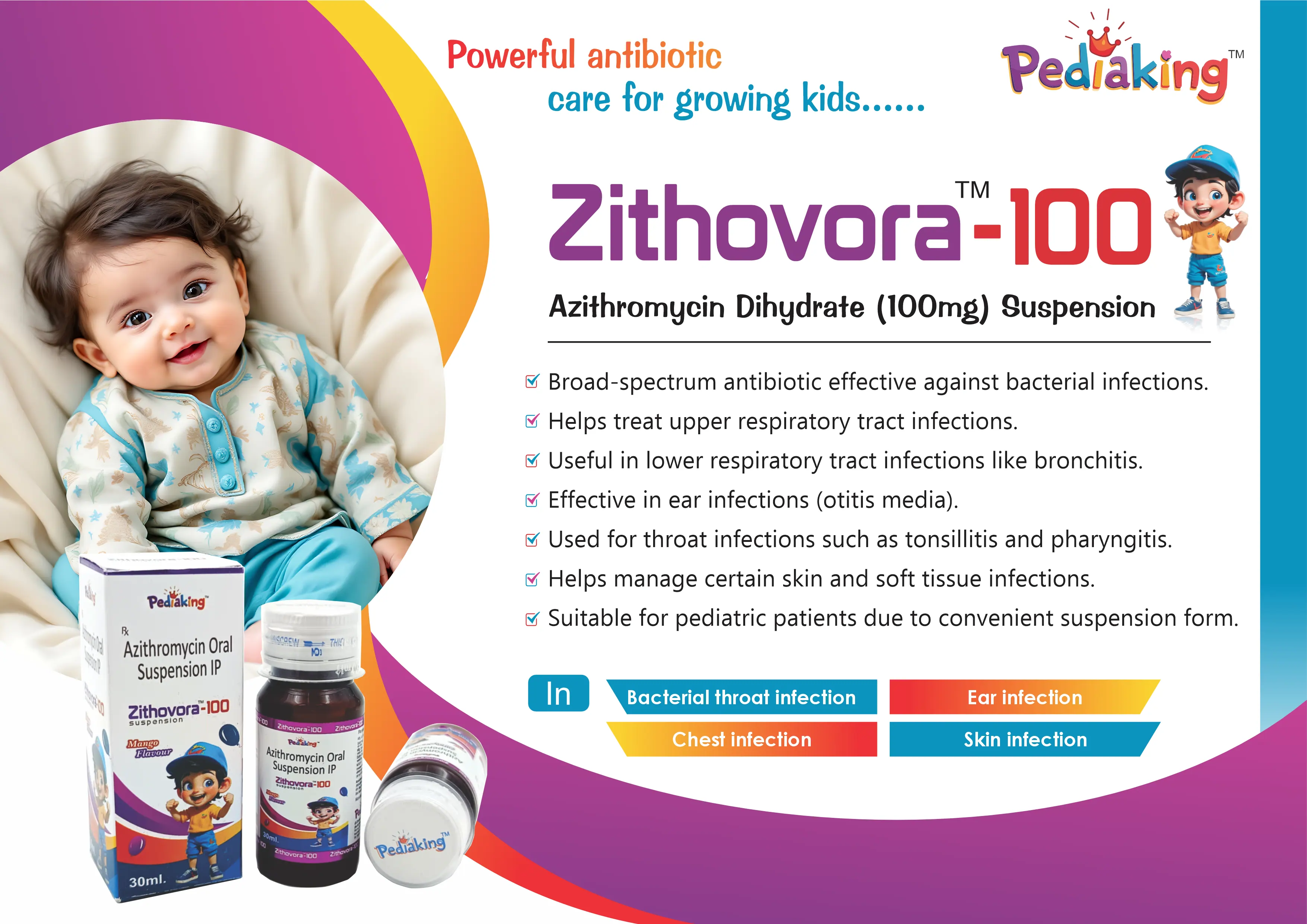 Zithovora 100 Syrup contains Azithromycin 100mg/5ml, a widely prescribed macrolide antibiotic used in the treatment of bacterial infections affecting the respiratory tract, ear, nose, throat, skin, and soft tissues in pediatric patients. It is known for its strong efficacy and short treatment duration.
