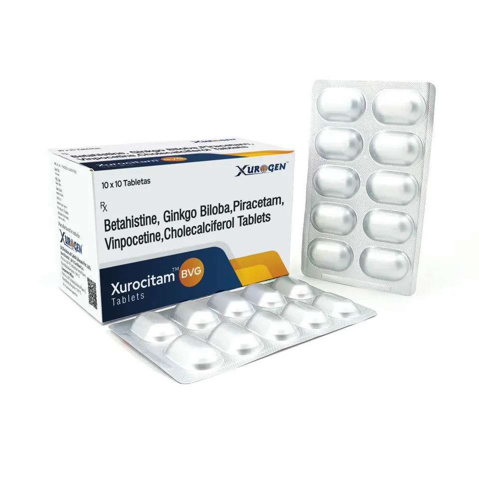 Xurocitam BVG Tablet contains Betahistine 16 mg, Piracetam 400 mg, Vinpocetine 5 mg, Ginkgo Biloba 60 mg, and Vitamin D3 400 IU, a comprehensive neuro-vascular formulation designed for advanced vertigo management, cognitive support, and cerebral circulation enhancement.