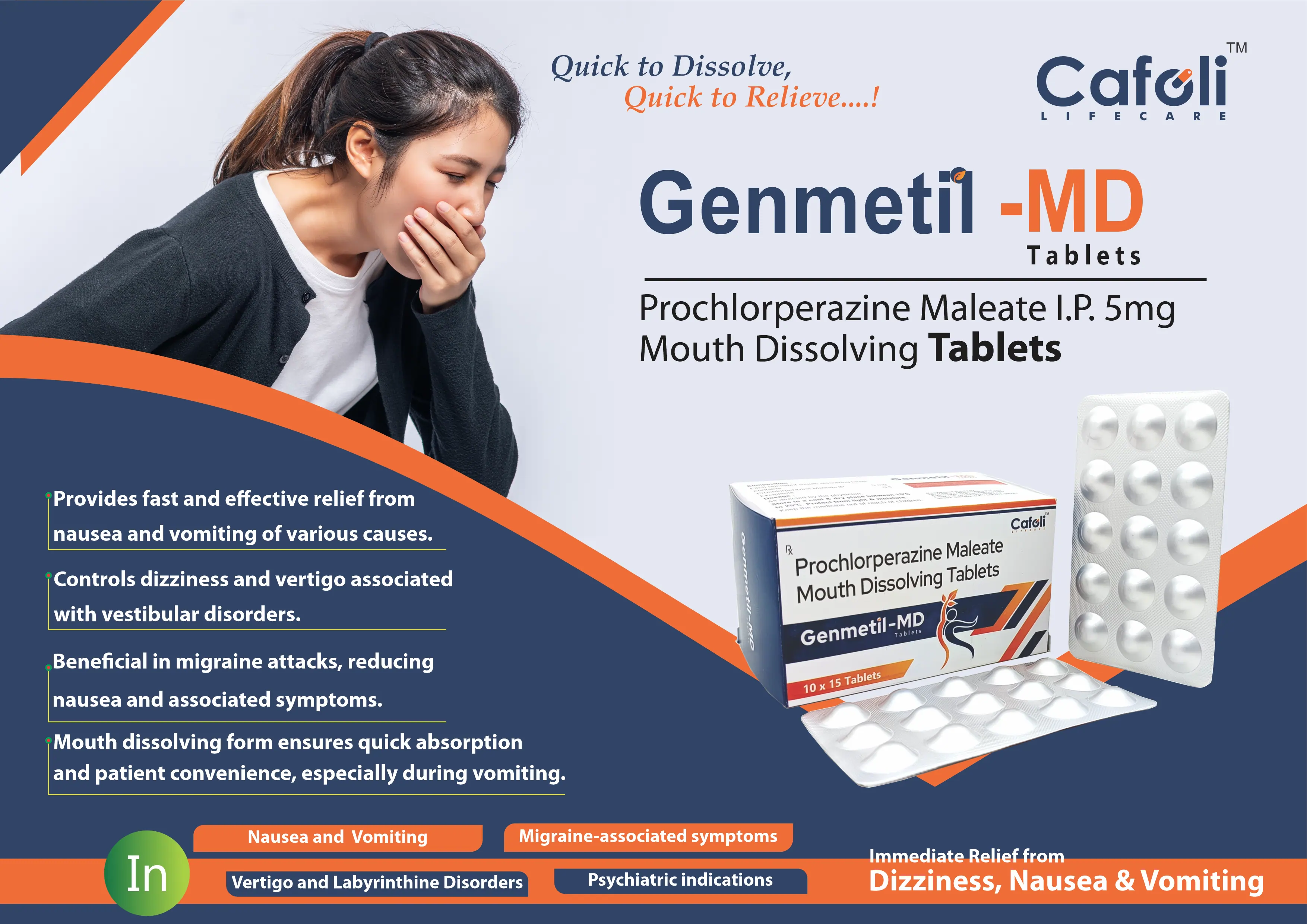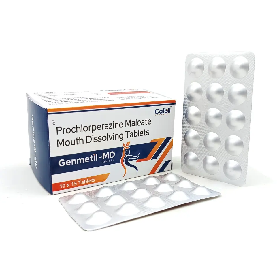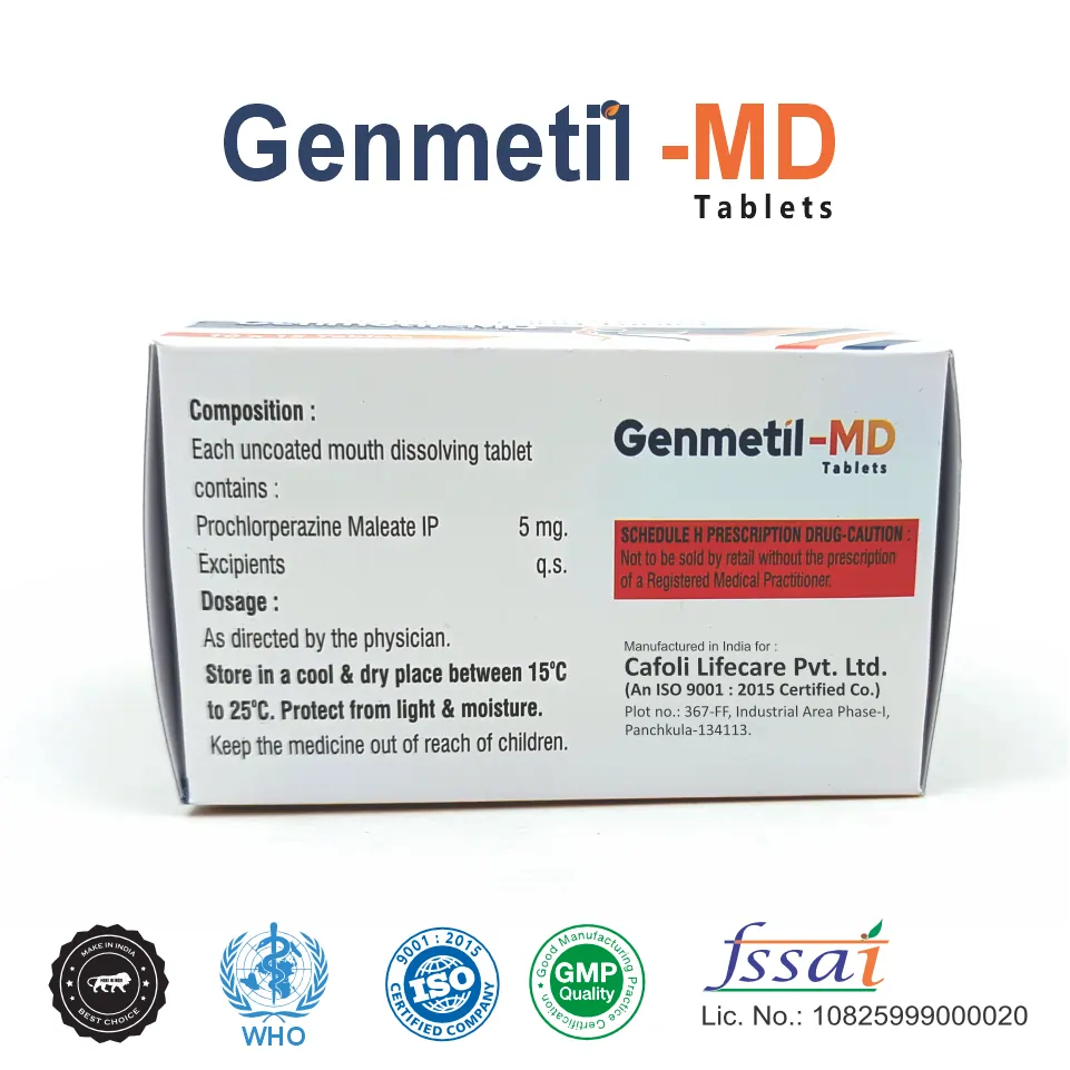 Genmetil MD Tablet is a fast-acting, orally disintegrating formulation containing Prochlorperazine (5mg), a trusted phenothiazine derivative widely used in the management of nausea, vomiting, vertigo, and certain psychiatric conditions such as anxiety and schizophrenia. It acts as a dopamine (D2) receptor antagonist, exerting its effects by regulating neurotransmitter activity in the brain and gastrointestinal tract.