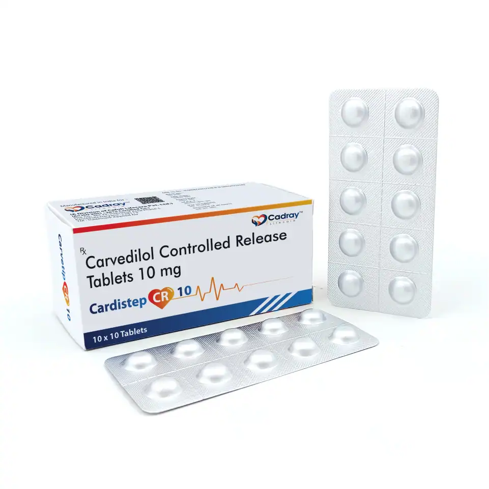 Cardistep CR 10 Tablet contains Carvedilol Controlled Release 10 mg, a beta-blocker used in the management of hypertension (high blood pressure), chronic heart failure, and angina (chest pain). This controlled-release formulation ensures a steady and prolonged release of the medication, offering sustained blood pressure control and cardiovascular protection with a once-daily dosage.