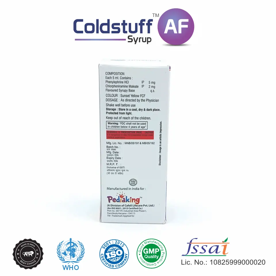 Coldstuff AF Syrup is a well-balanced combination syrup containing Chlorpheniramine Maleate and Phenylephrine, formulated to manage common cold, allergic rhinitis, sneezing, and nasal congestion effectively. The syrup form makes it suitable for both pediatric and adult patients, ensuring easy acceptance and compliance.