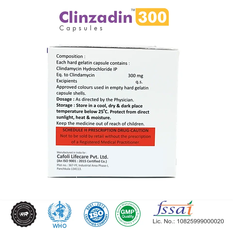 Clinzadin 300 Capsule is indicated for the treatment of respiratory tract infections, skin and soft tissue infections, bone and joint infections, intra-abdominal infections, and other susceptible bacterial infections, as prescribed by a healthcare professional.