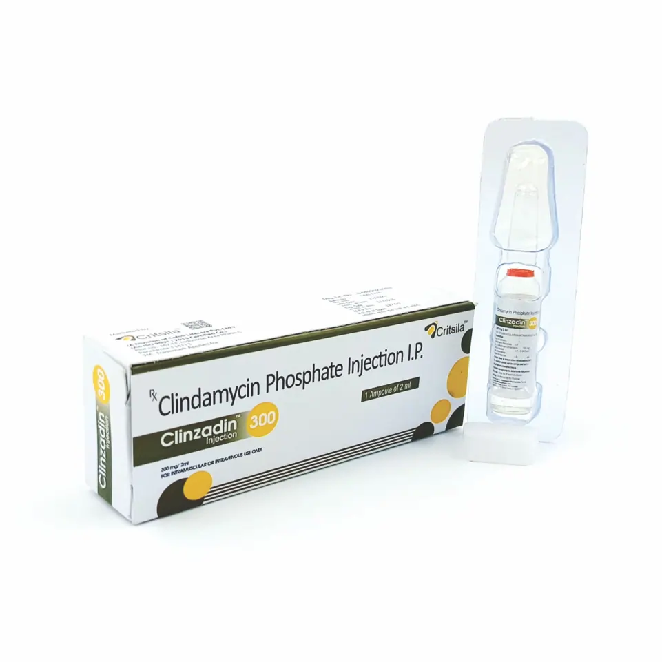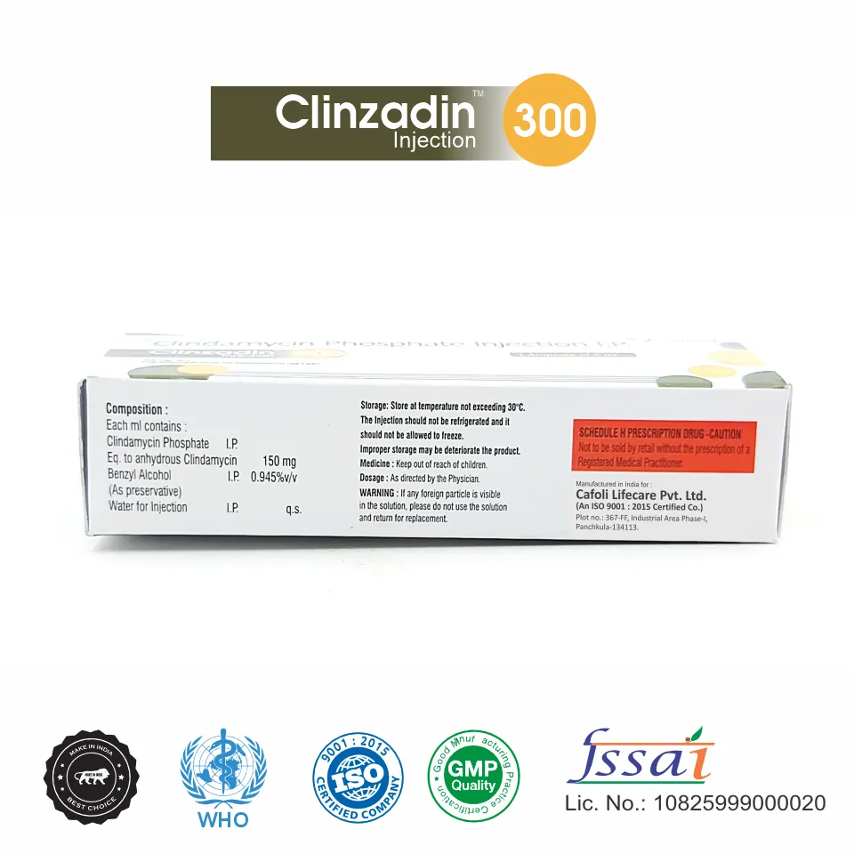 Clinzadin 300 Injection is a sterile, parenteral formulation containing clindamycin, a lincosamide antibiotic, at a concentration of 300 mg per vial. This medication is primarily indicated for the treatment of serious infections caused by anaerobic bacteria, as well as certain infections caused by susceptible strains of Gram-positive bacteria. Clindamycin works by inhibiting bacterial protein synthesis, thereby preventing the growth and multiplication of the bacteria.