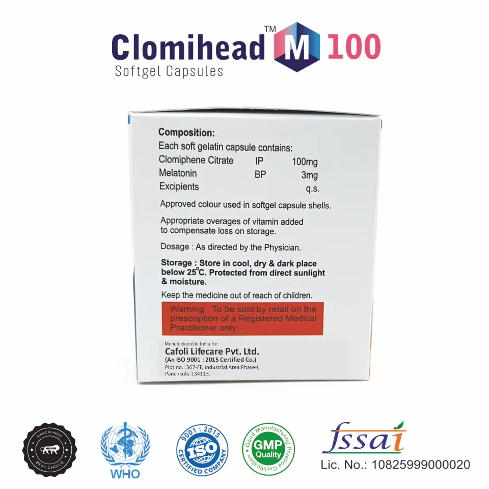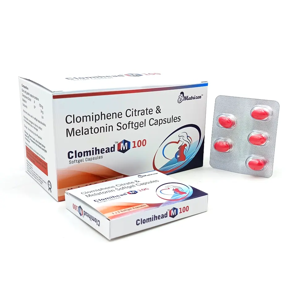 Clomihead M100 Capsule is a combination of Clomiphene (100mg) and Melatonin (3mg). Clomiphene is a selective estrogen receptor modulator (SERM) commonly used to treat female infertility, especially in cases of anovulation (lack of ovulation). It works by stimulating the release of hormones necessary for ovulation to occur. Melatonin, on the other hand, is a hormone that helps regulate sleep-wake cycles and is often used to support sleep disorders, particularly in individuals with irregular sleep patterns or those undergoing fertility treatments.