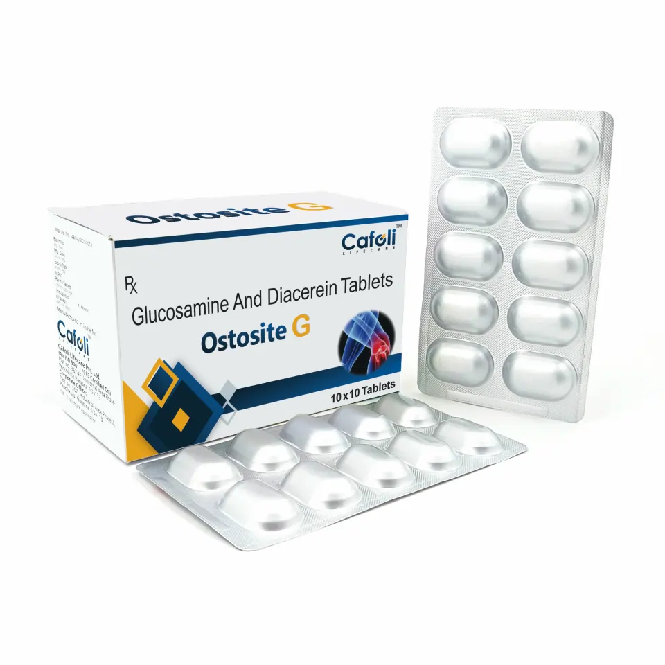 Ostosite G Tablet contains Diacerein 50 mg and Glucosamine 1500 mg, a synergistic combination for joint health and osteoarthritis management. Diacerein provides anti-inflammatory effects and cartilage-protective properties, while Glucosamine promotes cartilage synthesis, joint lubrication, and overall mobility support.