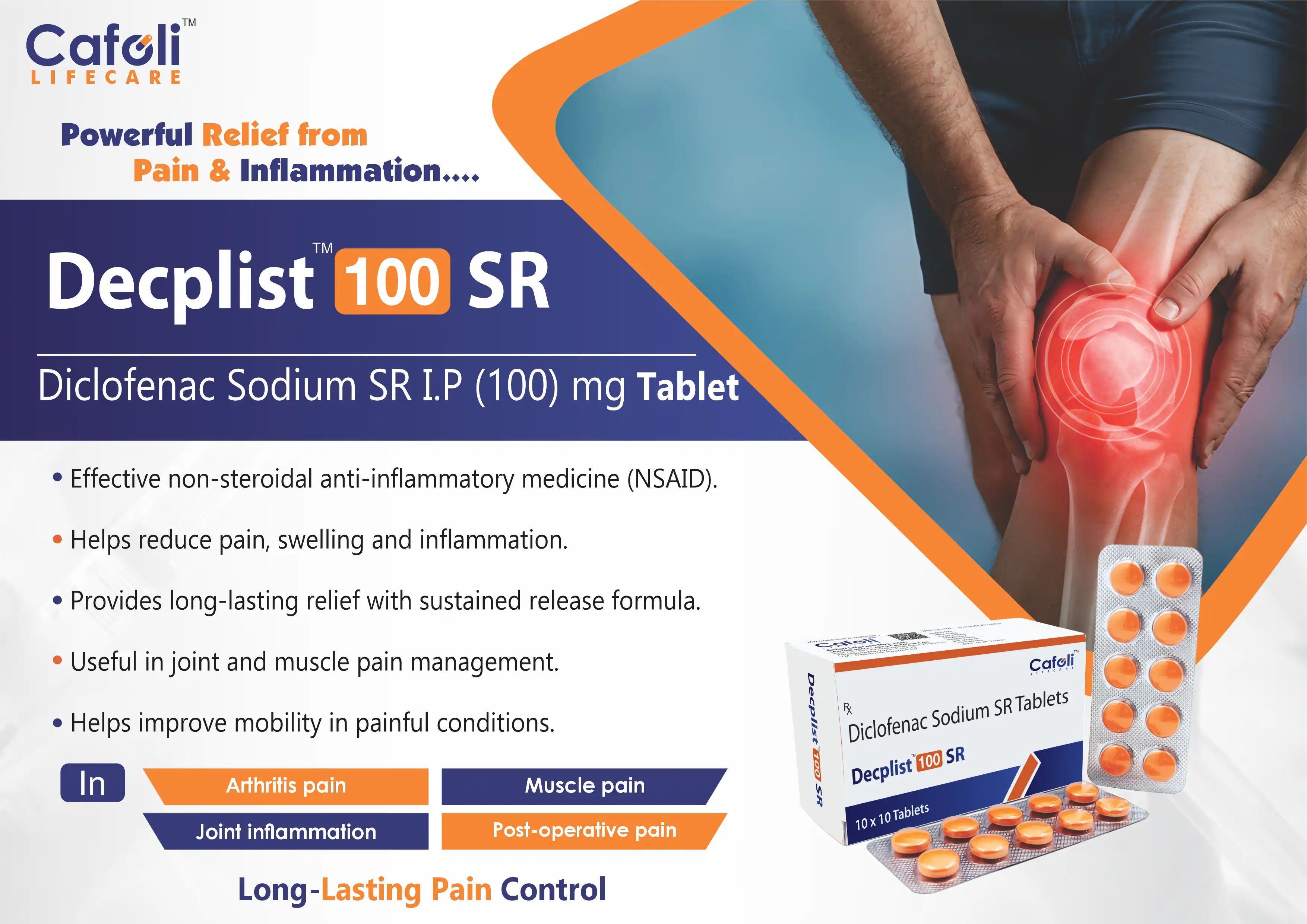 Decplist 100 SR Tablet contains Diclofenac, a potent nonsteroidal anti-inflammatory drug (NSAID) that provides effective relief from pain and inflammation. Diclofenac works by inhibiting the cyclooxygenase (COX) enzymes, which are responsible for the production of prostaglandins, substances that mediate pain, inflammation, and fever in the body. By blocking these enzymes, Diclofenac reduces swelling, pain, and stiffness, providing rapid relief from conditions associated with inflammation.