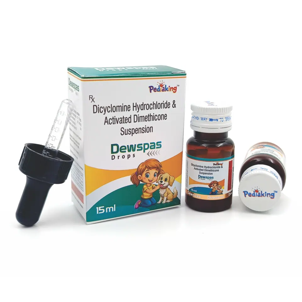 Dewspas Drop contains Dicyclomine 10mg + Dimethicone 40mg, a combination used for relieving abdominal cramps, spasms, and gas-related discomfort. It helps restore digestive comfort and reduce bloating, making it ideal for patients with functional gastrointestinal disorders.