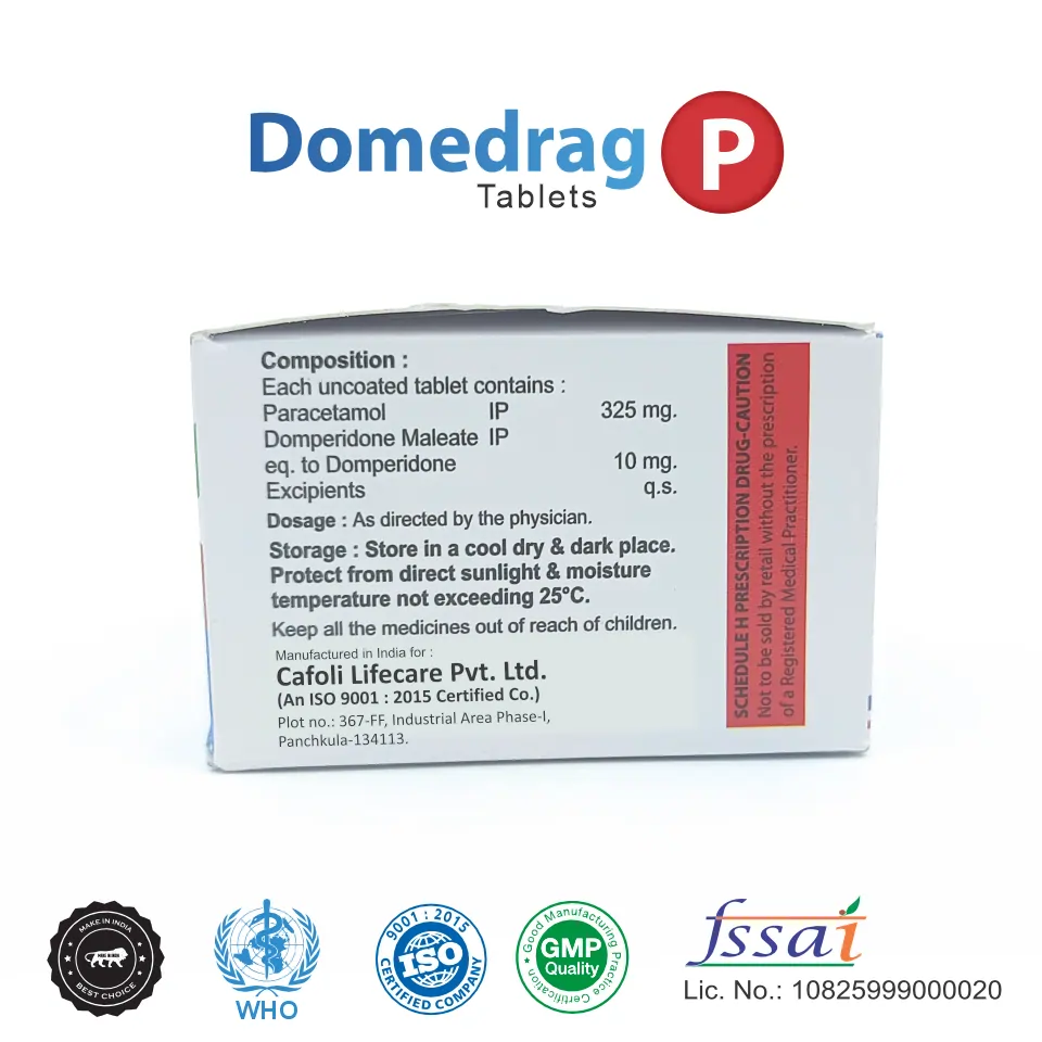Domdrag P Tablet combines two active ingredients, Domperidone (10mg) and Paracetamol (325mg), to provide effective relief from common symptoms such as nausea, vomiting, and pain. The combination of these ingredients makes it a versatile treatment for gastrointestinal discomfort and pain management.