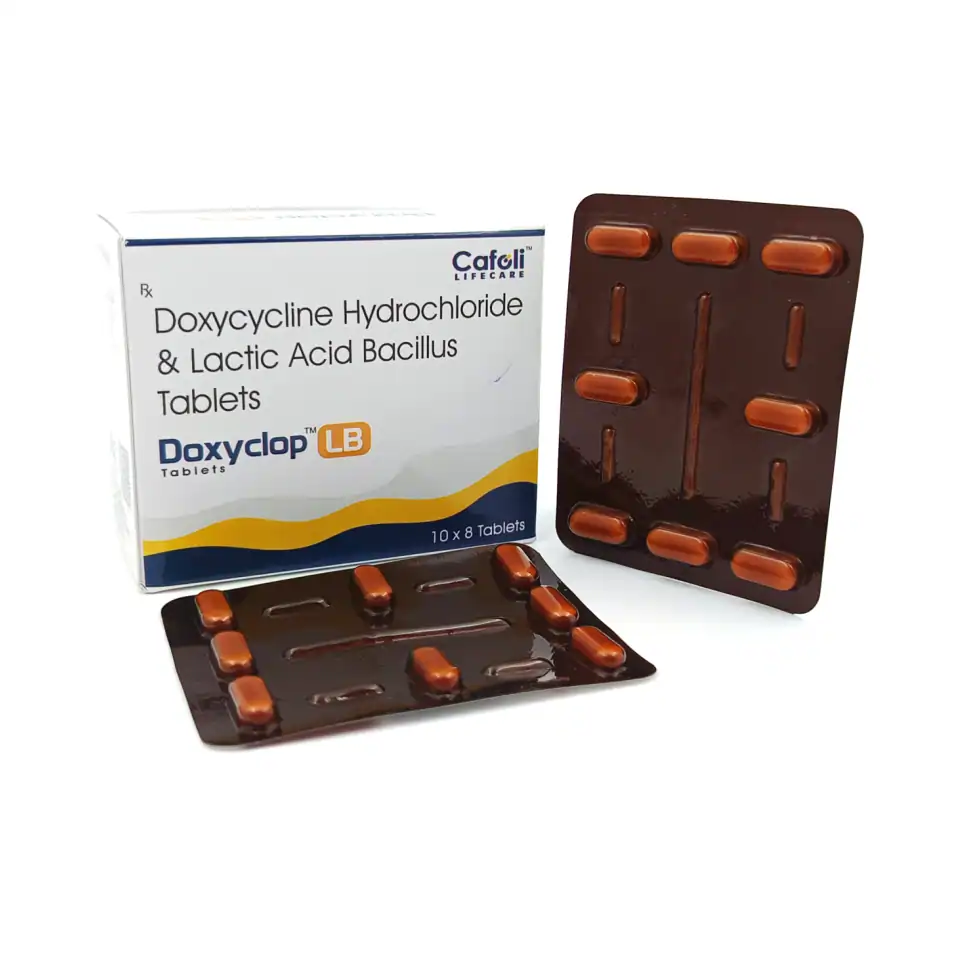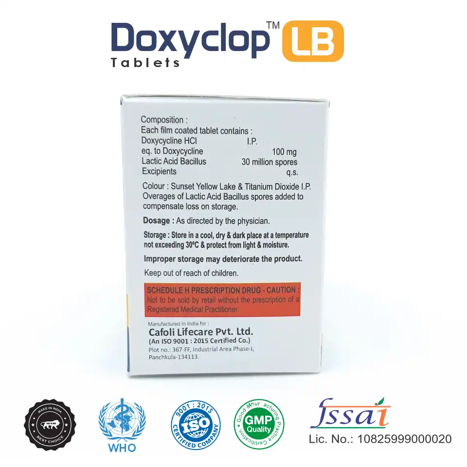 Doxyclop LB Tablet combines the antibiotic properties of doxycycline with the beneficial effects of lactobacillus, providing a unique approach to managing bacterial infections while supporting gut health. Doxycycline, a broad-spectrum tetracycline antibiotic, effectively combats a wide range of bacterial infections, including respiratory tract infections, skin infections, and certain sexually transmitted diseases. It works by inhibiting bacterial protein synthesis, leading to the eradication of the infection.