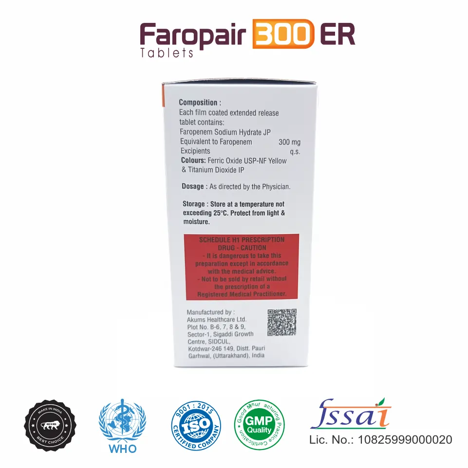 Faropair 300 Tablet is indicated for the treatment of various bacterial infections, including respiratory tract infections, urinary tract infections, and skin and soft tissue infections.