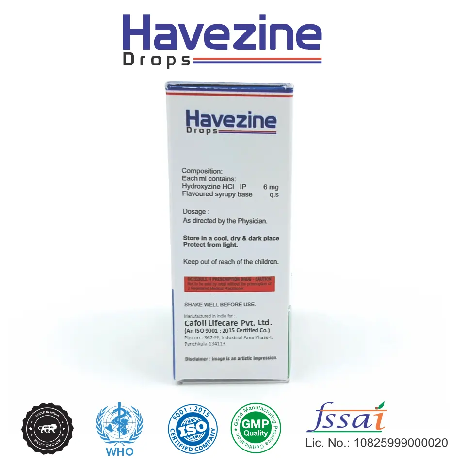 Havezine Drop is indicated for the treatment of allergic conditions such as urticaria, allergic dermatitis, pruritus, insect bite reactions, and other hypersensitivity reactions. It may also be used as an adjunct in anxiety-related symptoms and for premedication where mild sedation is required, as prescribed by a physician.