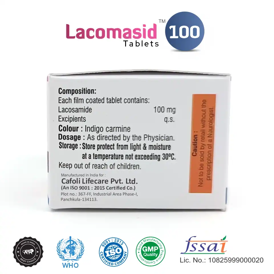 Lacomasid 100 Tablet contains Lacosamide 100mg, a novel antiepileptic agent used for managing partial-onset seizures and epilepsy in adults and children. It works by stabilizing hyperexcitable neuronal membranes and inhibiting repetitive neuronal firing, effectively reducing seizure frequency and severity.
