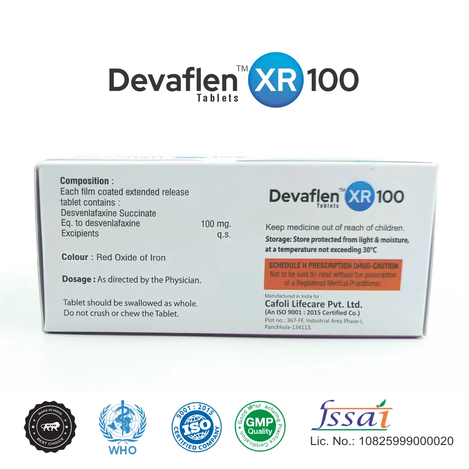 Devaflen XR 100 Tablet falls under the neuropsychiatry and mental wellness segment, widely prescribed by psychiatrists, clinical psychologists, and general physicians.