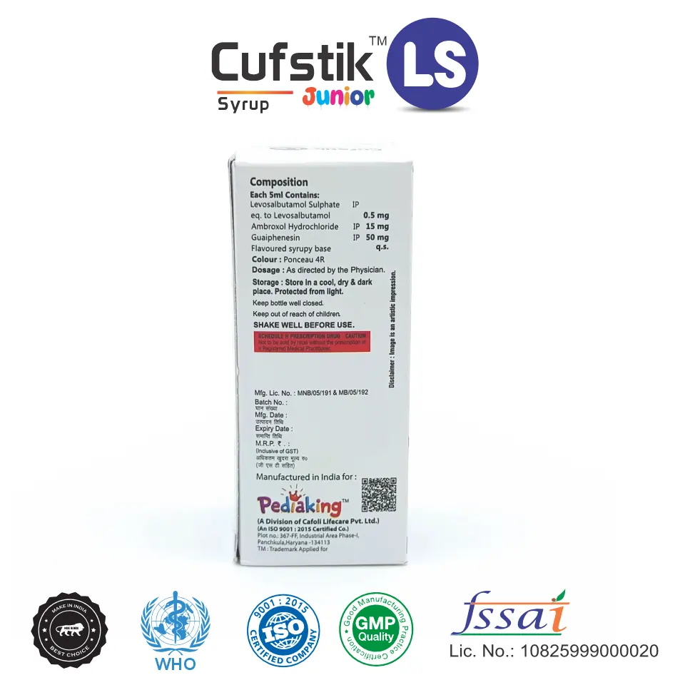 Cufstik LS Junior Syrup contains Levosalbutamol 0.5mg/5ml + Ambroxol 15mg/5ml + Guaifenesin 50mg/5ml, a combination used for relieving cough, loosening mucus, and easing bronchial spasms in children. It helps improve breathing comfort and reduce respiratory distress.