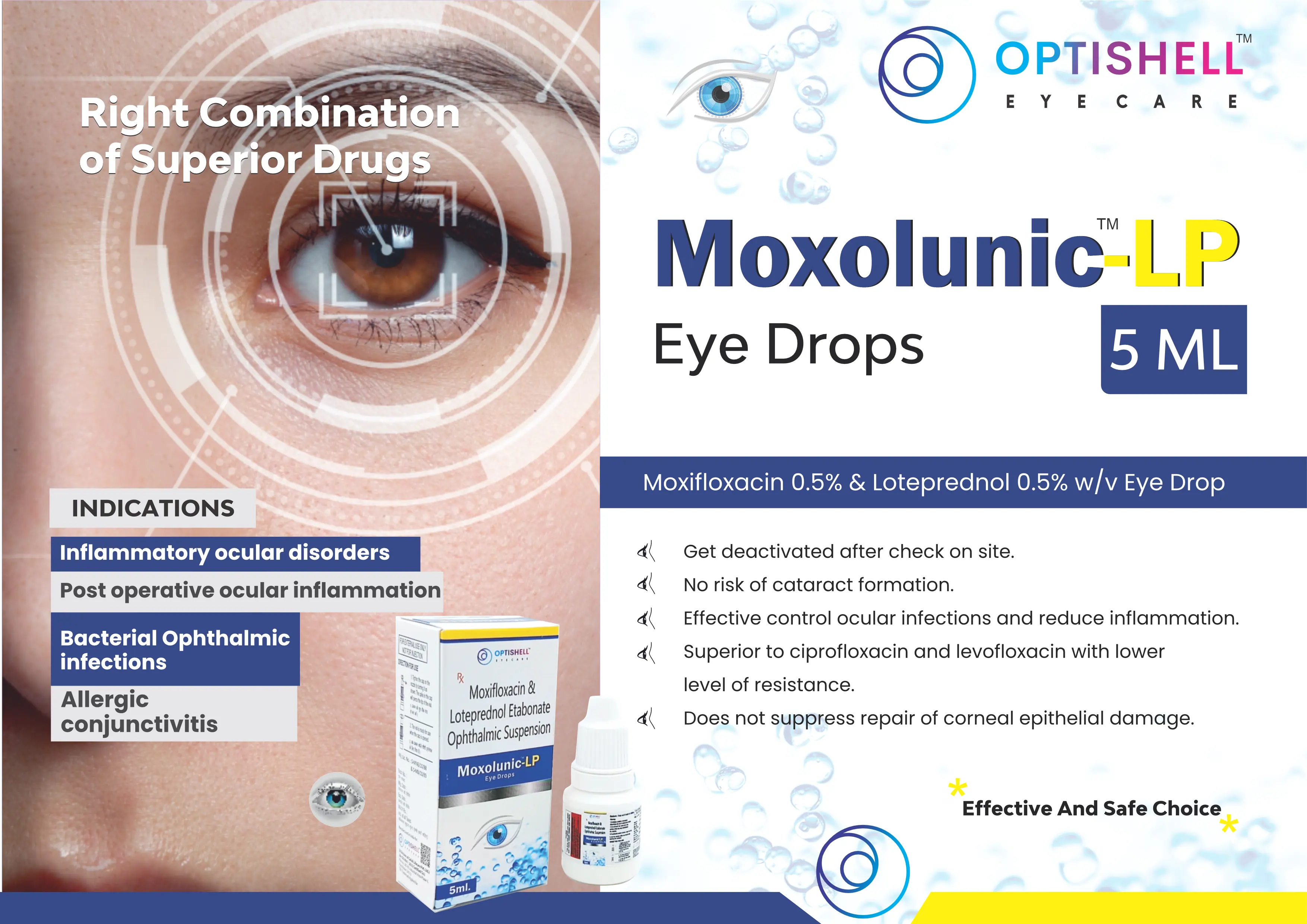 Moxolunic LP Eye Drop is a combination ophthalmic solution containing Loteprednol etabonate (0.5% w/v), a corticosteroid, and Moxifloxacin (0.5% w/v), a broad-spectrum antibiotic. This synergistic formulation is designed to effectively manage inflammatory and bacterial eye conditions, offering relief from discomfort while addressing underlying infections.