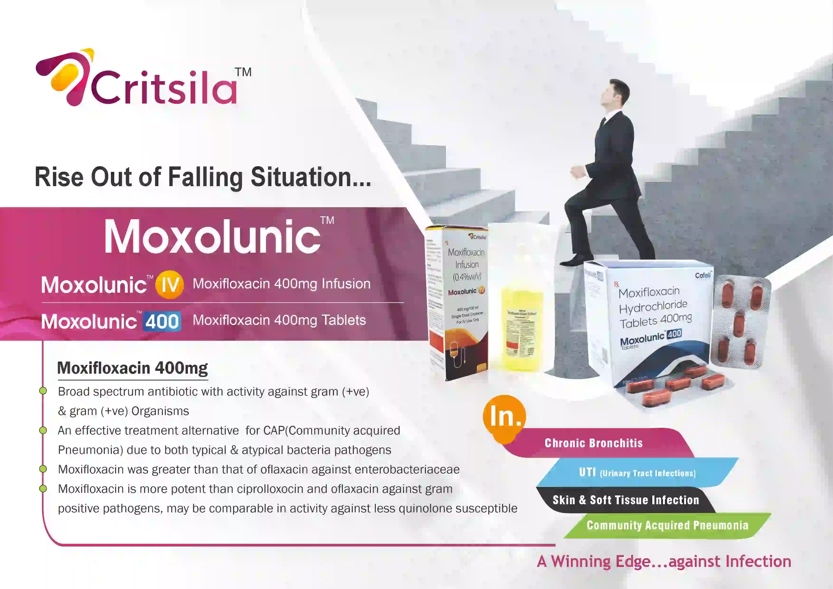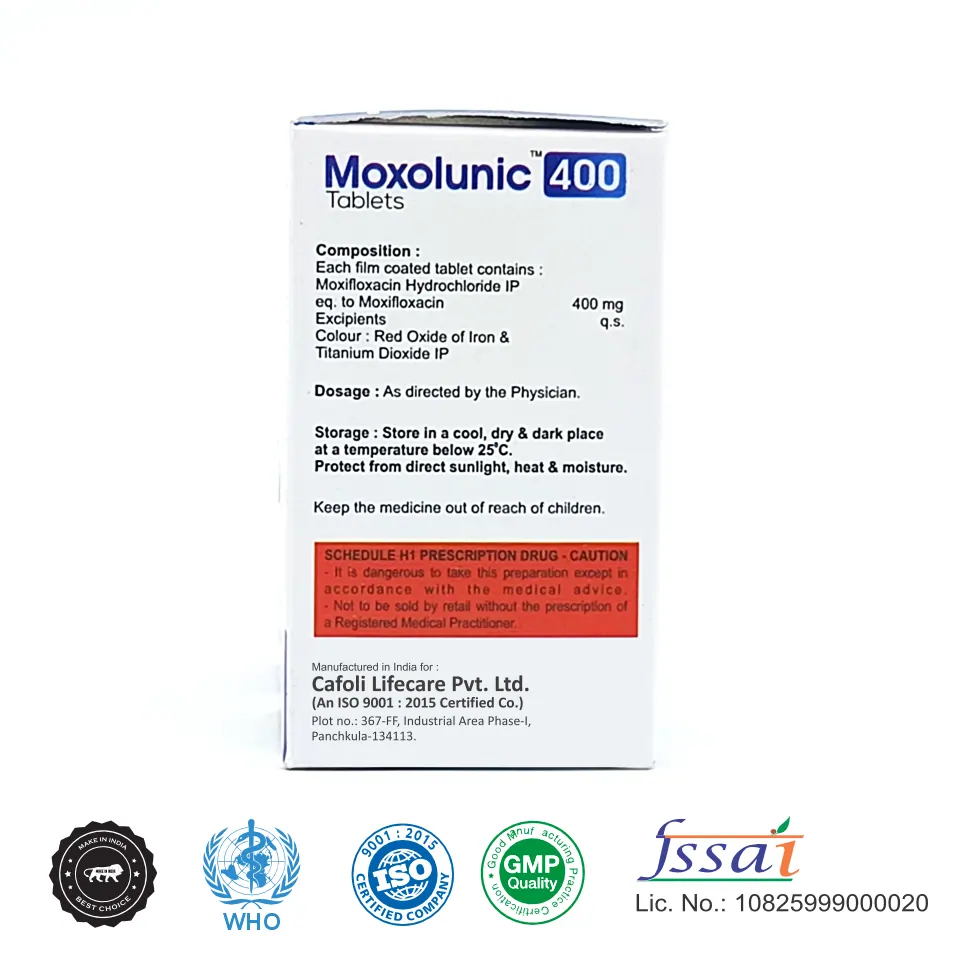 Moxolunic 400 Tablet is indicated for the treatment of respiratory tract infections, skin and soft tissue infections, intra-abdominal infections, and other bacterial infections caused by susceptible organisms, as prescribed by a healthcare professional.