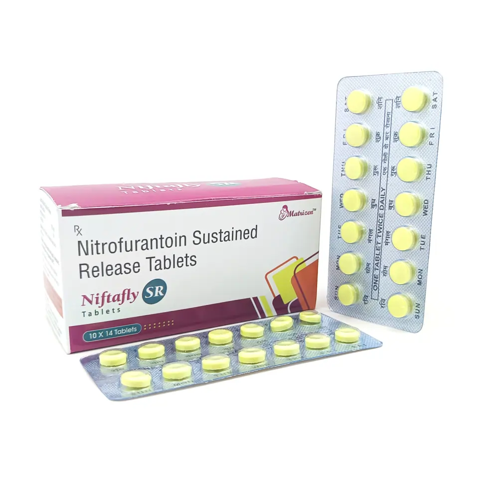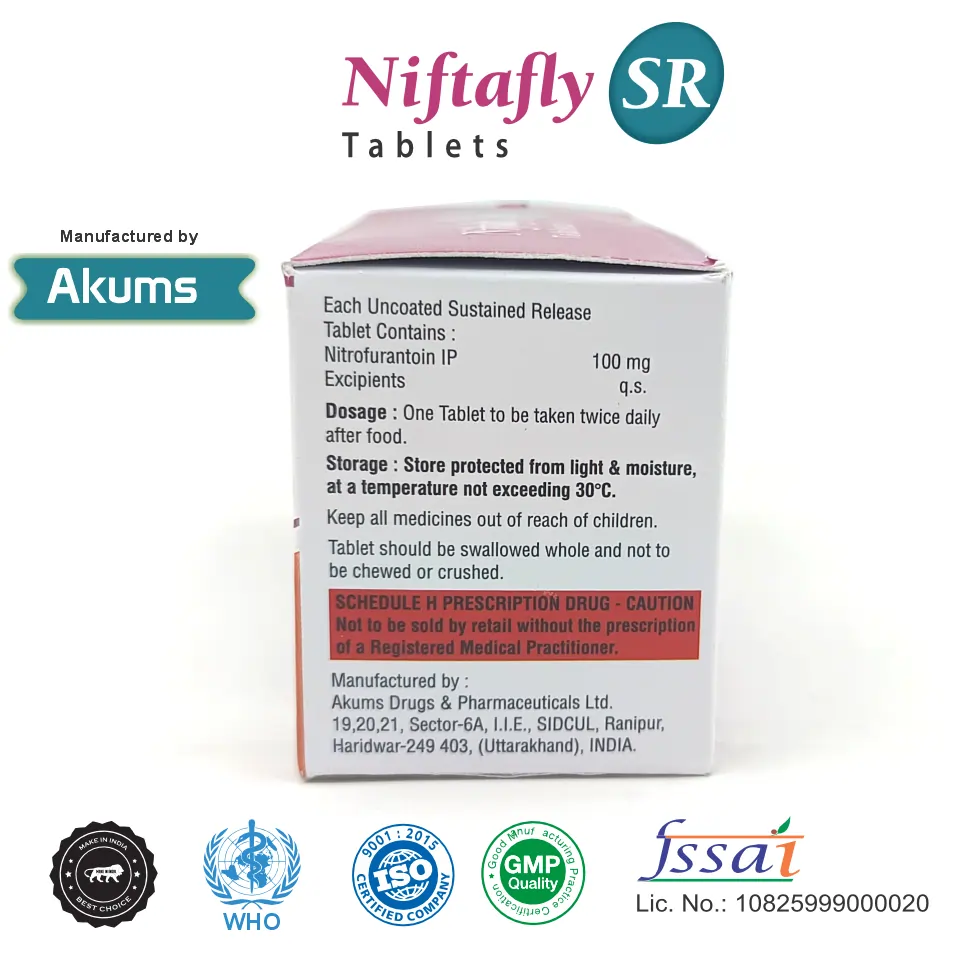 Niftafly 100 Tablet contains Nitrofurantoin SR 100mg, a sustained-release antibacterial agent indicated for the treatment and prophylaxis of urinary tract infections caused by susceptible bacteria. It helps relieve symptoms such as dysuria, urinary frequency, and lower abdominal discomfort.