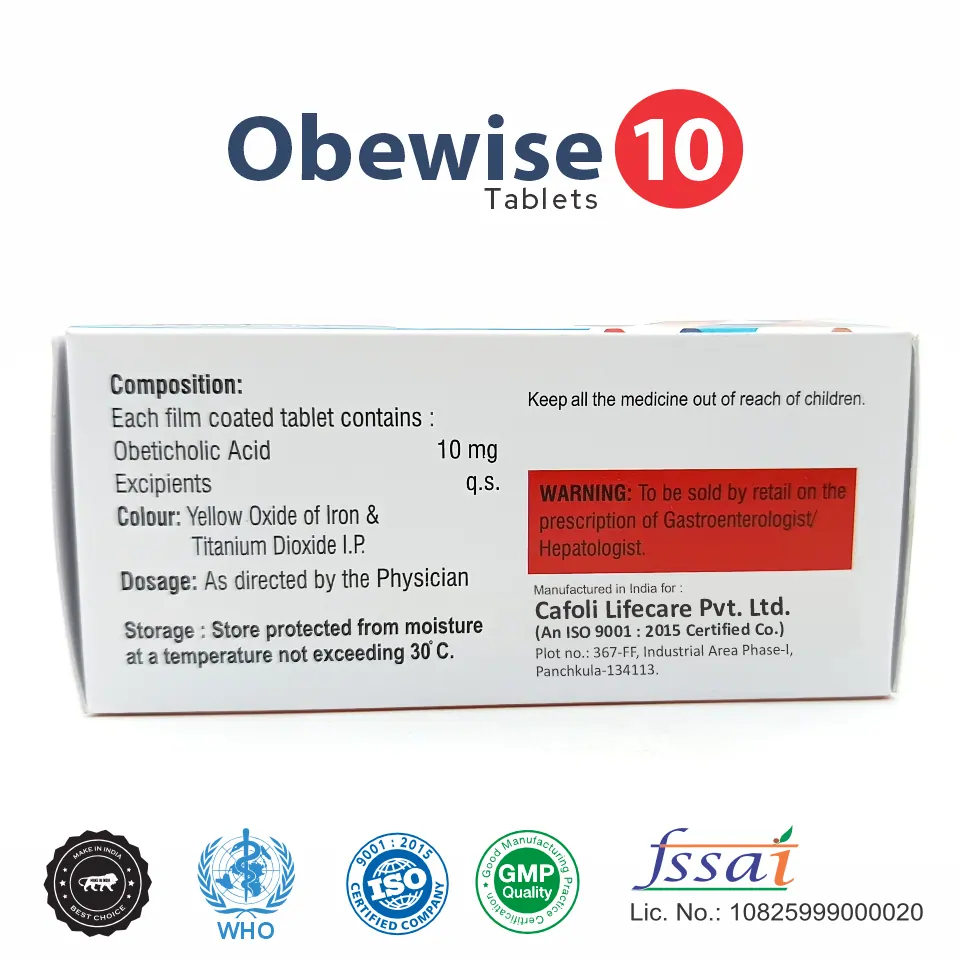 Obewise 10 is primarily indicated for the treatment of patients with PBC, a chronic autoimmune disease that leads to the progressive destruction of the bile ducts in the liver. By enhancing bile flow and reducing the accumulation of toxic bile acids, Obeticholic acid helps alleviate symptoms associated with liver dysfunction, such as fatigue, pruritus (itching), and jaundice. Additionally, it may improve liver histology and slow the progression of fibrosis in patients with advanced liver disease.