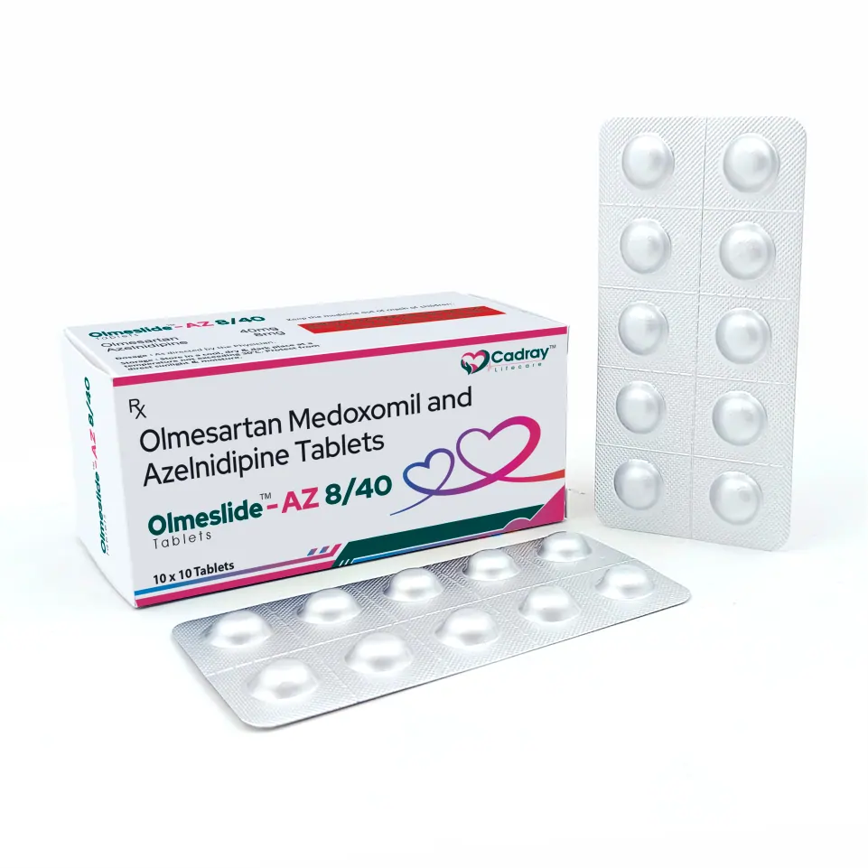 Olmeslide AZ 8-40 Tablet contains Olmesartan Medoxomil 40mg, an angiotensin II receptor blocker that reduces vasoconstriction and prevents fluid retention, combined with Azelnidipine 8mg, a long-acting calcium channel blocker that enhances vascular relaxation. This combination provides potent and sustained blood pressure reduction, suitable for patients requiring higher-dose therapy.