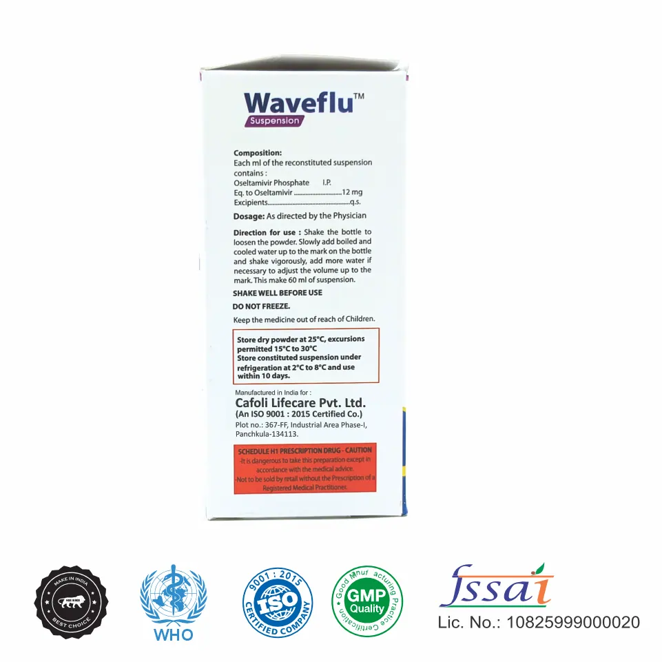 Waveflu Syrup (Oseltamivir Phosphate 12mg/ml) from Cafoli Lifecare is a critical antiviral medication, perfectly positioned to meet the high demand for influenza treatment and prevention in the Indian market. As a potent Neuraminidase Inhibitor, Waveflue effectively combats both Influenza A and B viruses, offering essential support, particularly in the pediatric segment.