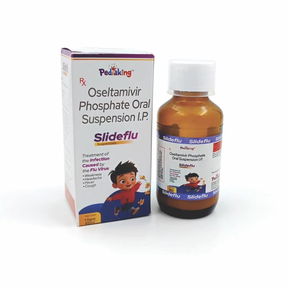 Slideflu Suspension contains Oseltamivir Phosphate 12mg, a clinically proven anti-viral agent for the treatment and prevention of influenza (flu). The syrup form makes it suitable for pediatric and adult patients, ensuring accurate dosing and compliance.