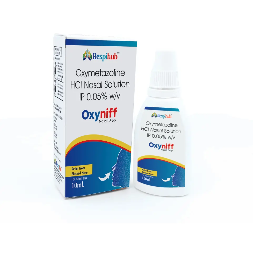 Oxyniff Nasal Drop contains Oxymetazoline 0.1% w/v, a nasal decongestant indicated for the relief of nasal congestion associated with allergic rhinitis, sinusitis, common cold, and other upper respiratory conditions. It helps in reducing nasal swelling and improving airflow for easier breathing.