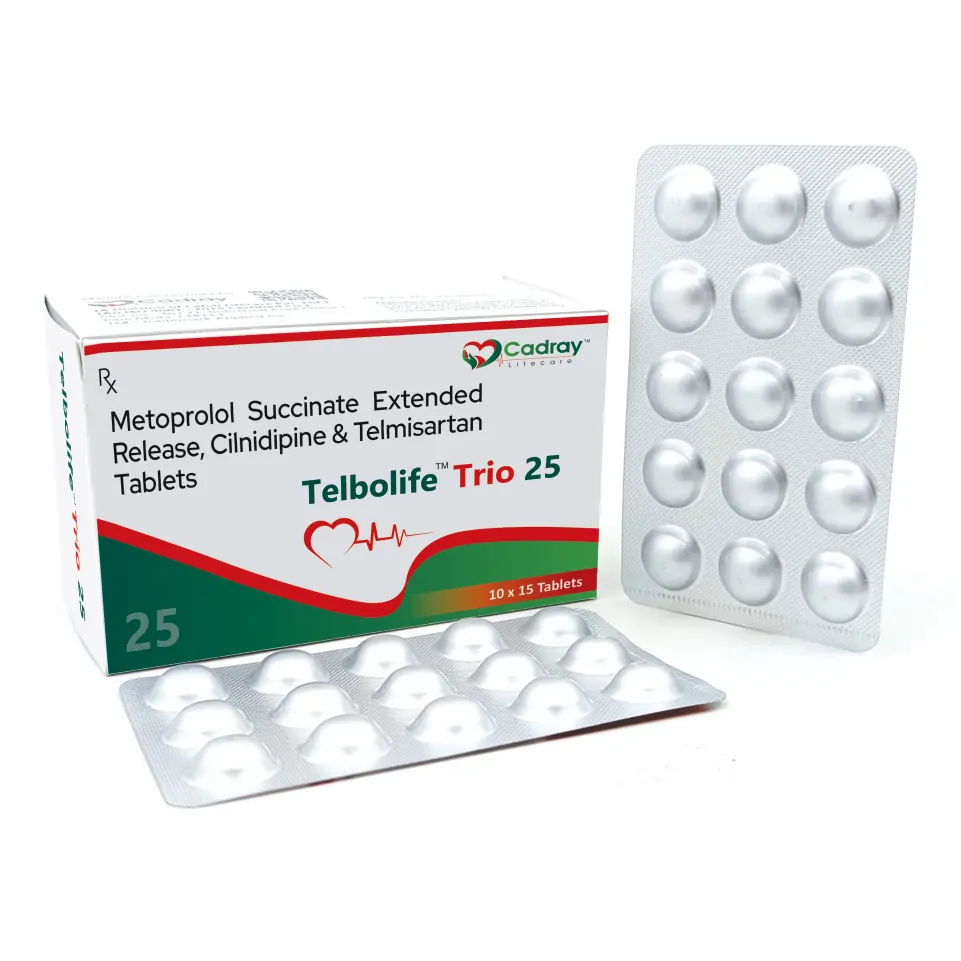 Telbolife Trio 25 Tablet is a fixed-dose combination used in the effective management of hypertension (high blood pressure) and cardiovascular risk reduction. It contains Telmisartan, an angiotensin II receptor blocker (ARB) that relaxes blood vessels; Cilnidipine, a calcium channel blocker that lowers blood pressure by preventing calcium influx in blood vessel walls; and Metoprolol Succinate, a cardio-selective beta-blocker that reduces heart rate and myocardial oxygen demand. This triple-drug combination offers synergistic control of blood pressure, improved arterial compliance, and protection against heart-related complications.