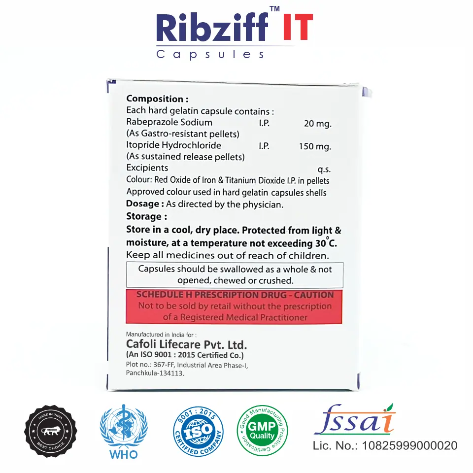 Rabeprazole 20mg + Itopride 150mg capsule is a combination gastrointestinal formulation developed for the management of acid-related disorders accompanied by impaired gastric motility, offering balanced symptom control and improved digestive comfort.