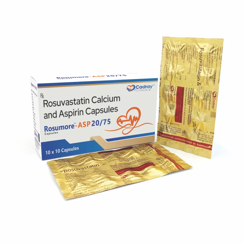 Rosumore ASP Capsule combines Rosuvastatin 20 mg, a statin that helps lower cholesterol levels, with Aspirin 75 mg, which acts as a blood thinner to prevent blood clots. This combination is used to reduce the risk of cardiovascular events like heart attacks and strokes by managing cholesterol and improving blood flow.