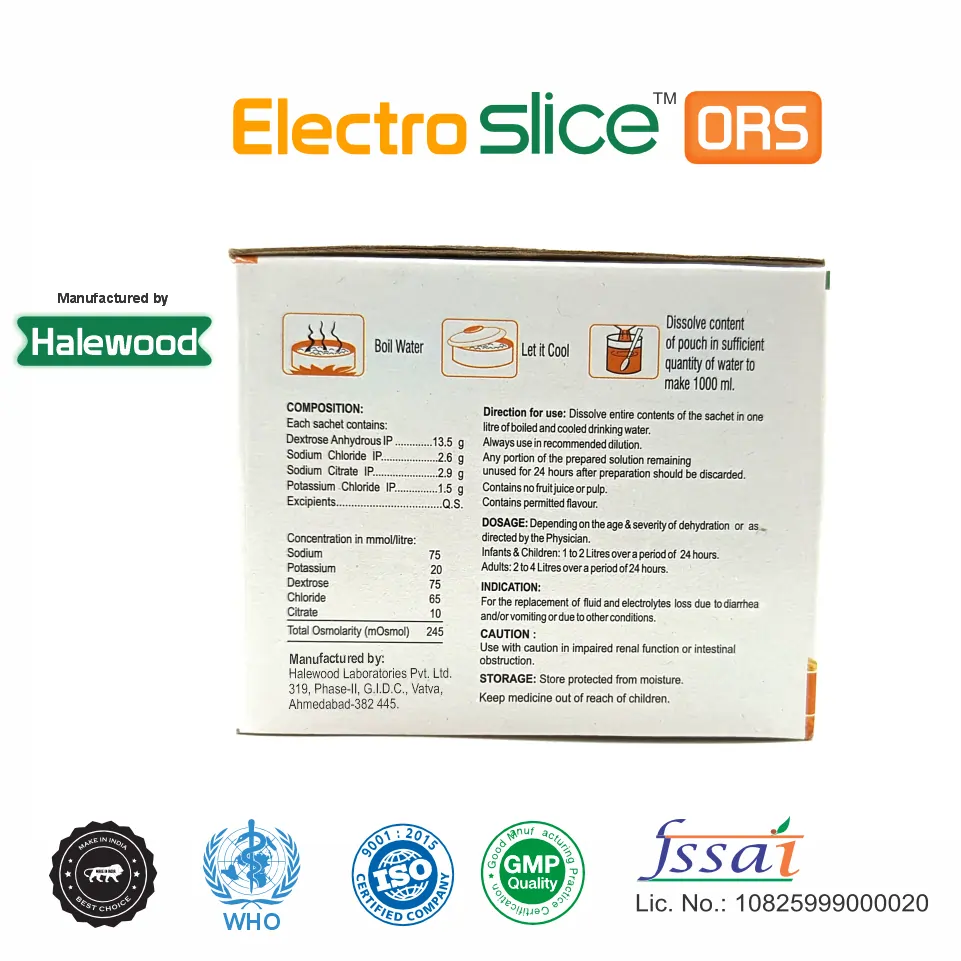 This ORS sachet containing sodium chloride, potassium chloride, sodium citrate, and dextrose is a critical rehydration therapy solution designed to restore electrolytes and fluids lost due to diarrhea, vomiting, or dehydration.