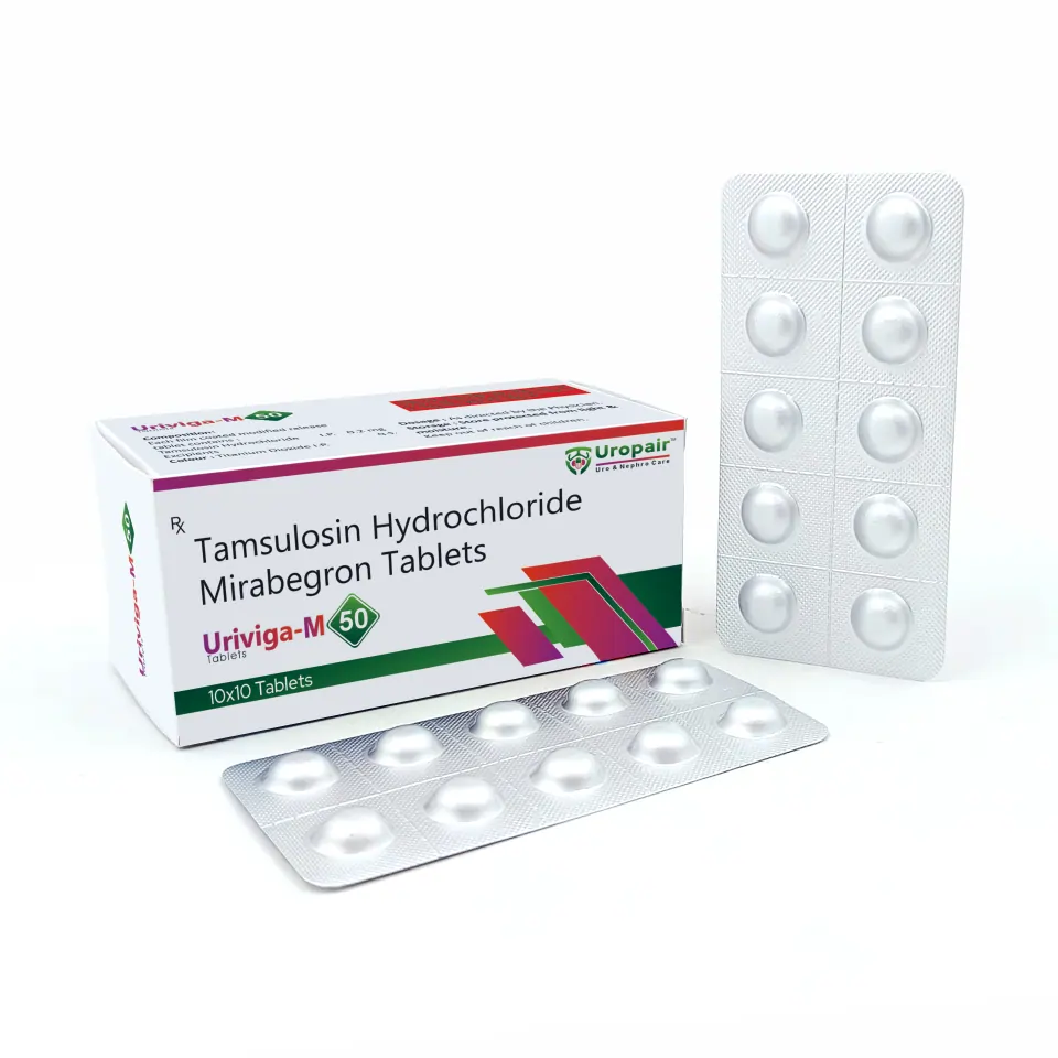 Uriviga M 50 Tablet contains Tamsulosin 0.4mg + Mirabegron 50mg, a dual-action therapy for managing urinary disorders, including bladder outlet obstruction and overactive bladder. Tamsulosin relaxes the smooth muscles of the urinary tract to improve urine flow, while Mirabegron supports bladder muscle relaxation and reduces urgency, ensuring comprehensive symptom relief and patient comfort.