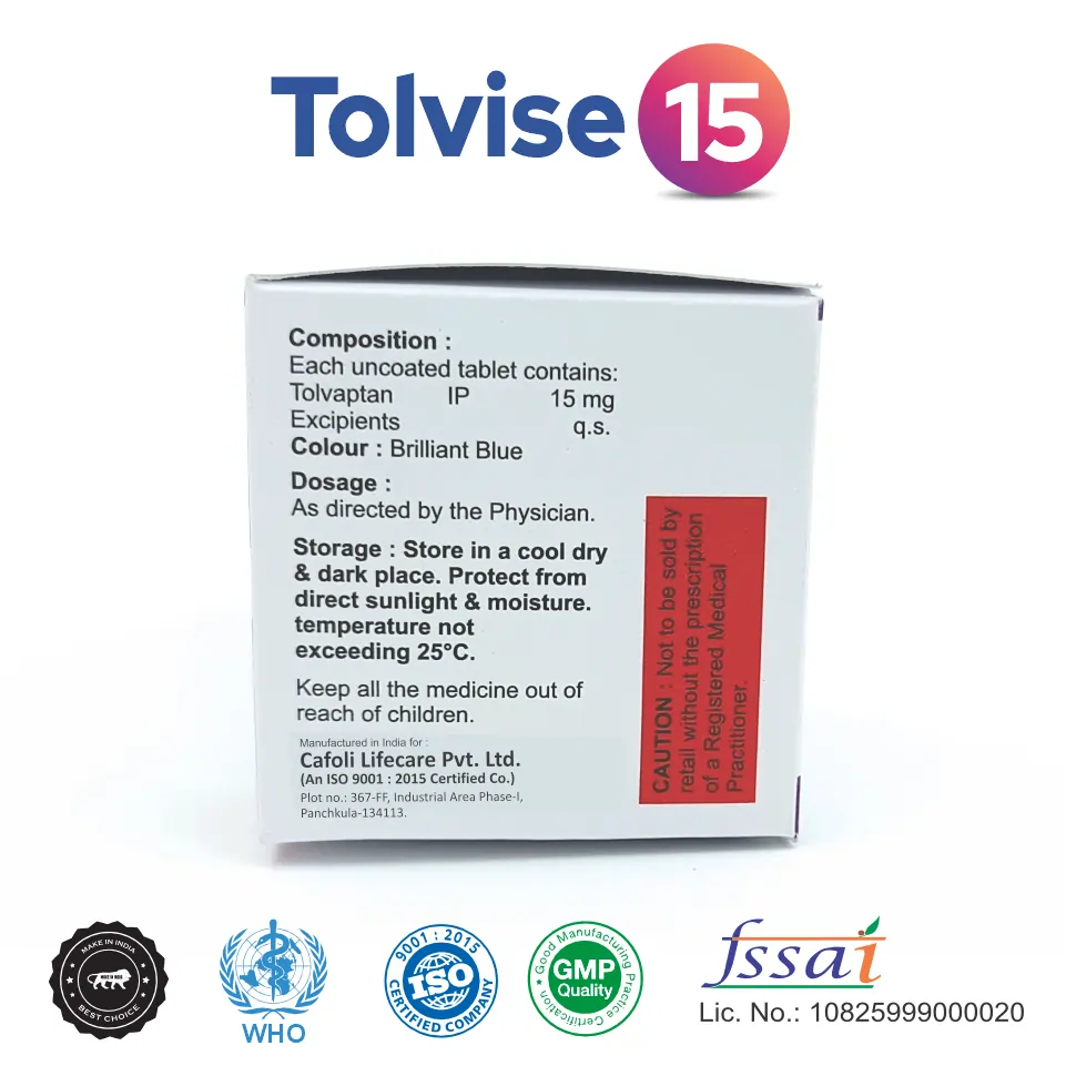 At Cafoli Lifecare, we are committed to providing our B2B pharma partners with high-quality, profitable products. Our Tolvise 15 Tablet is manufactured under strict quality controls and comes with a competitive pricing structure. By partnering with us, you gain access to a reliable supply of this essential medication and the comprehensive support needed to succeed in the wholesale pharma market. Choose this product to build a strong and reputable business in the specialized segment.
