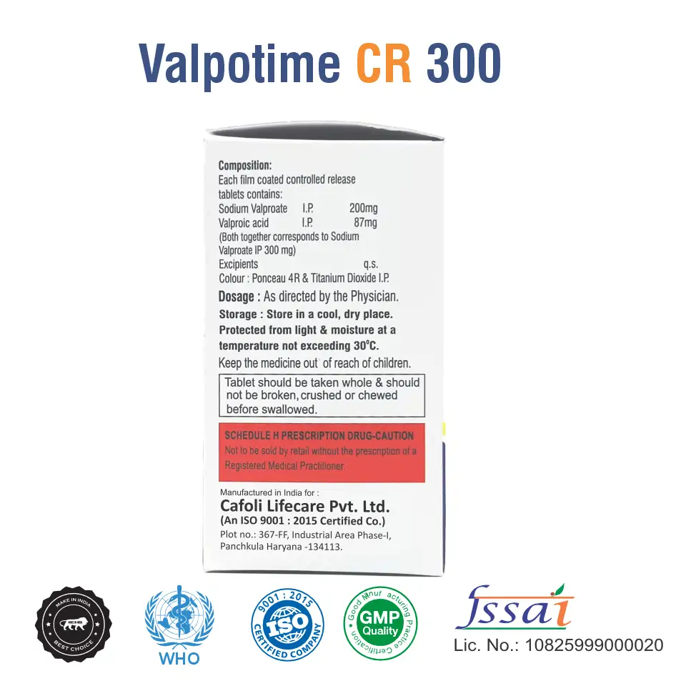 Valpotime CR 300 Tablet is indicated for the management of epilepsy, including generalized and partial seizures, bipolar disorder, and migraine prophylaxis, as prescribed by a healthcare professional.