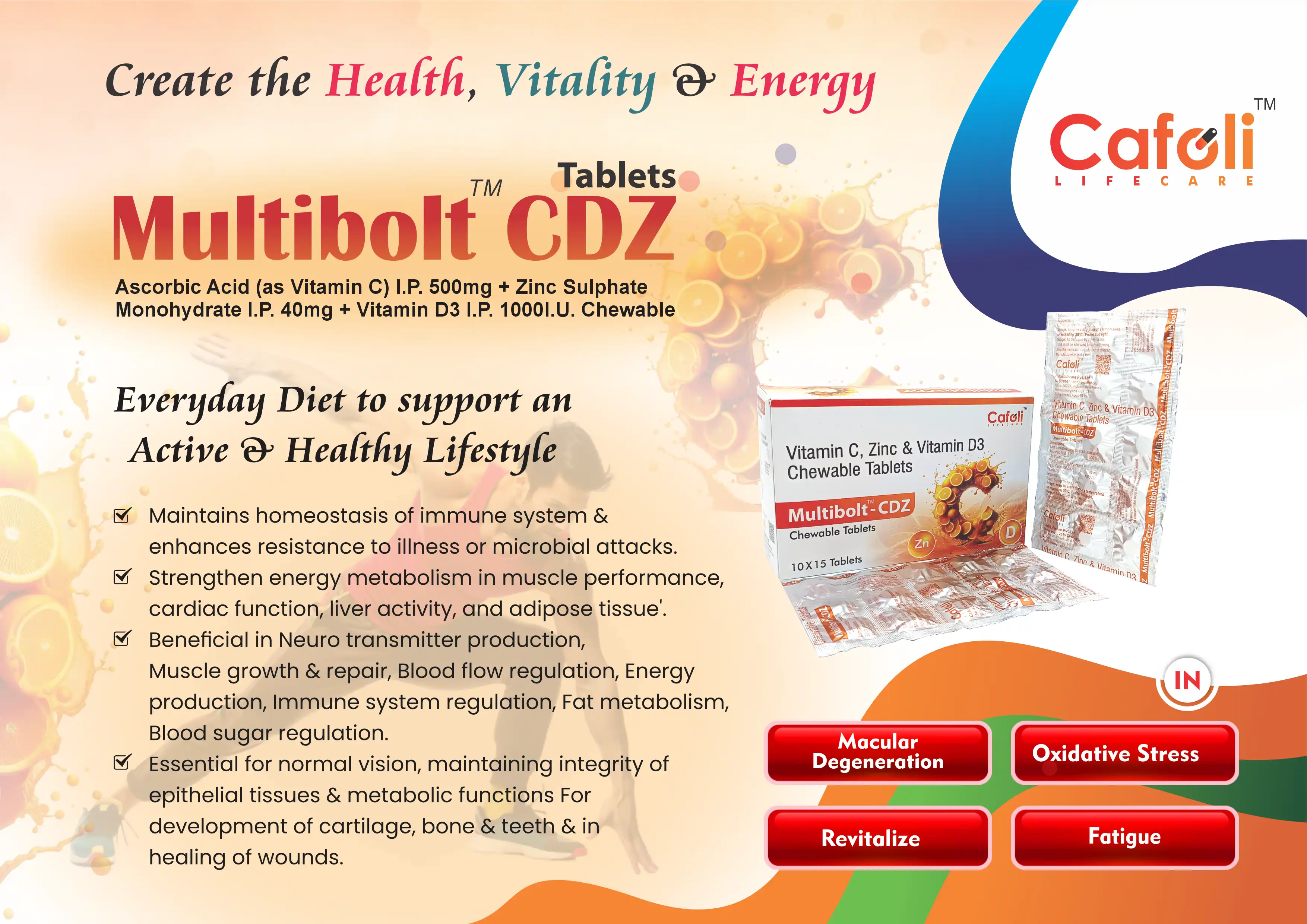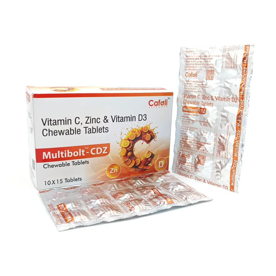 Multibolt CDZ Tablet is a specially formulated chewable tablet designed to strengthen immunity and support overall health. This potent combination of Vitamin C, Vitamin D, and Zinc offers comprehensive benefits for boosting the immune system, enhancing bone health, and promoting cellular repair.