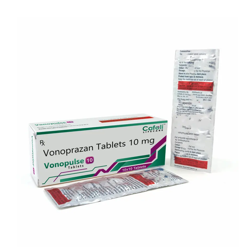 Vonopulse 10 Tablet contains Vonoprazan 10mg, a next-generation acid suppressant belonging to the potassium-competitive acid blocker (P-CAB) class. It delivers rapid and sustained inhibition of gastric acid secretion, making it effective in managing GERD, acid reflux, and ulcer-related conditions.