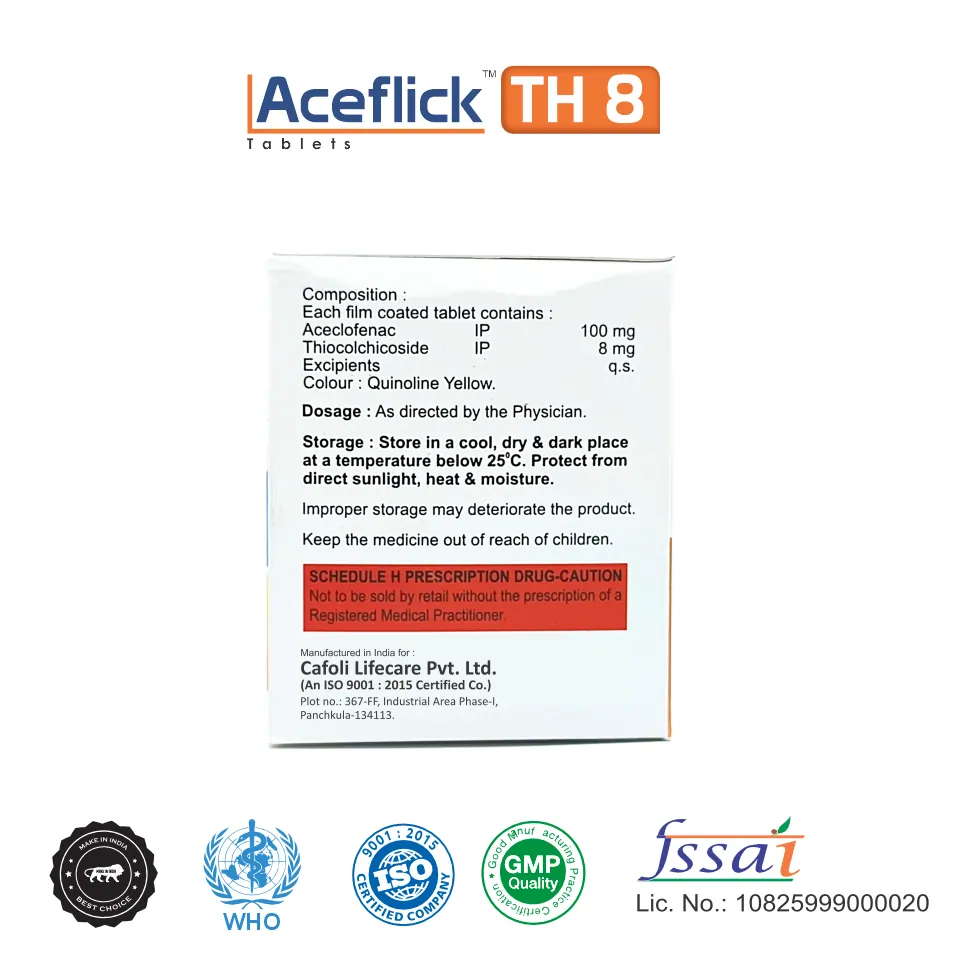Aceflick TH8 Tablet is a combination medication designed to alleviate pain caused by muscle spasms, enhancing muscle mobility and providing relief from associated discomfort.