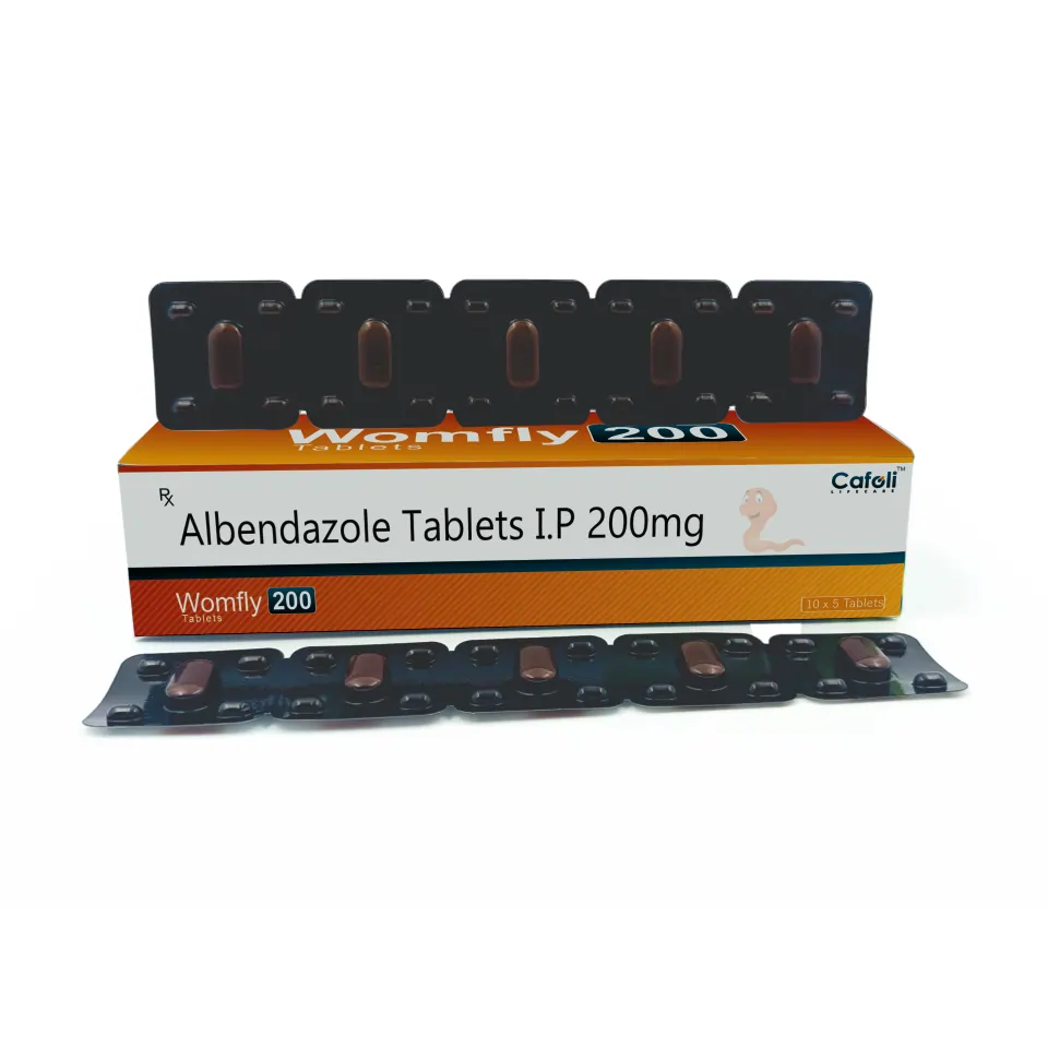 Womfly 200 Tablet contains Albendazole 200 mg, a broad-spectrum anthelmintic agent widely used for the treatment of intestinal and tissue parasitic worm infestations. It works by inhibiting microtubule formation and glucose uptake in parasites, leading to depletion of energy stores and eventual parasite death.