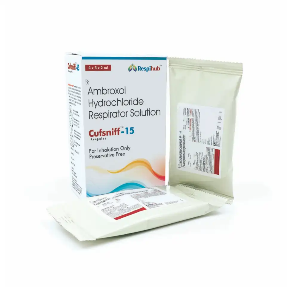 Cufsniff Respules are a specialized and highly effective medication containing Ambroxol Hydrochloride 15 mg, formulated as a solution for nebulization. As a potent mucolytic agent, it is designed to treat respiratory conditions where thick or excessive mucus is a primary problem. Ambroxol works by breaking down the fibrous structure of phlegm, thinning it and making it easier to cough out. This action provides significant relief from symptoms like chest congestion, shortness of breath, and a persistent cough, thereby improving breathing and overall respiratory function. The precise and effective delivery via a nebulizer ensures that the medication reaches the lungs directly, providing quick and reliable relief for patients.