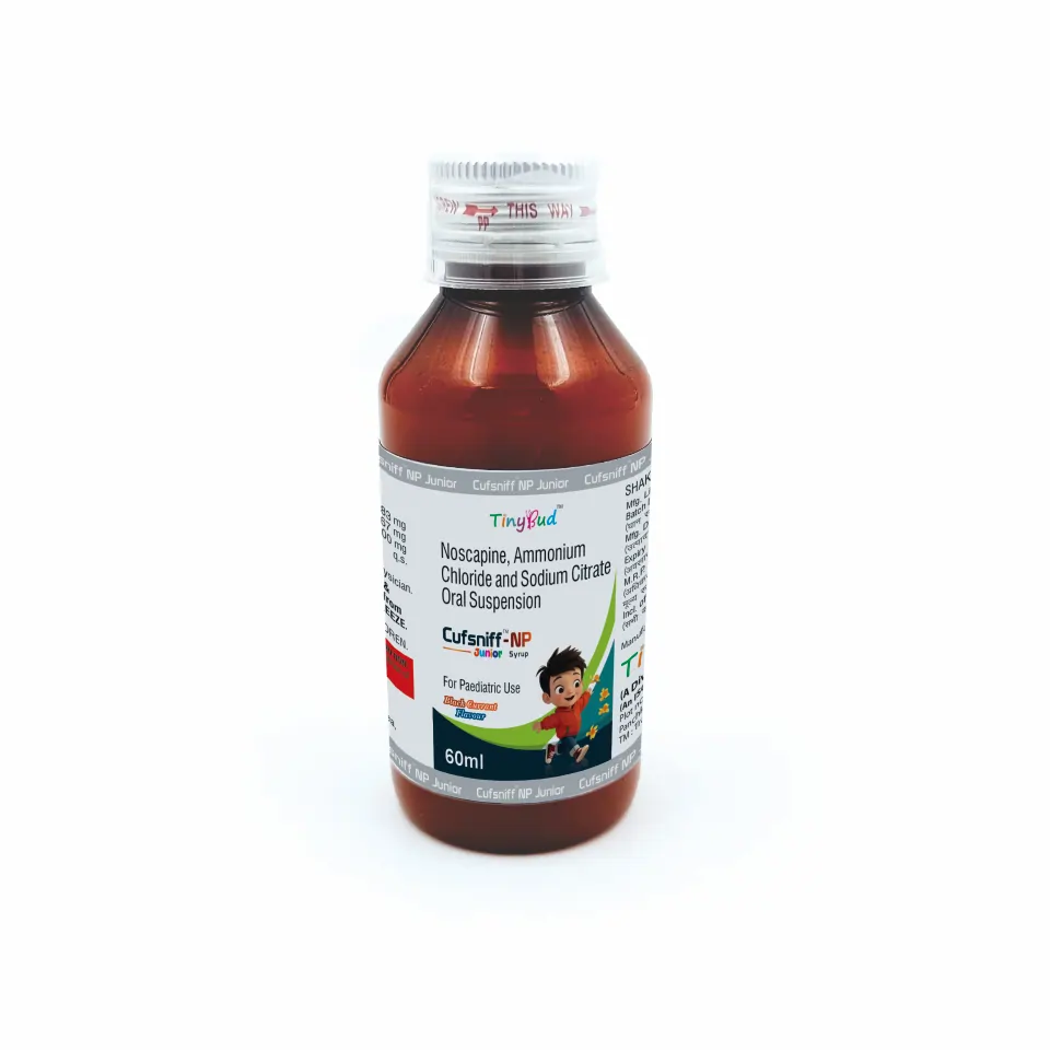 Cufsniff NP Junior Syrup is a multi-component respiratory syrup combining Ammonium Chloride (7mg/5ml), Noscapine (1.83mg/5ml), and Sodium Citrate (0.67mg/5ml). This combination is designed to ease cough, reduce mucus viscosity, and soothe the respiratory tract, providing comprehensive symptomatic relief.