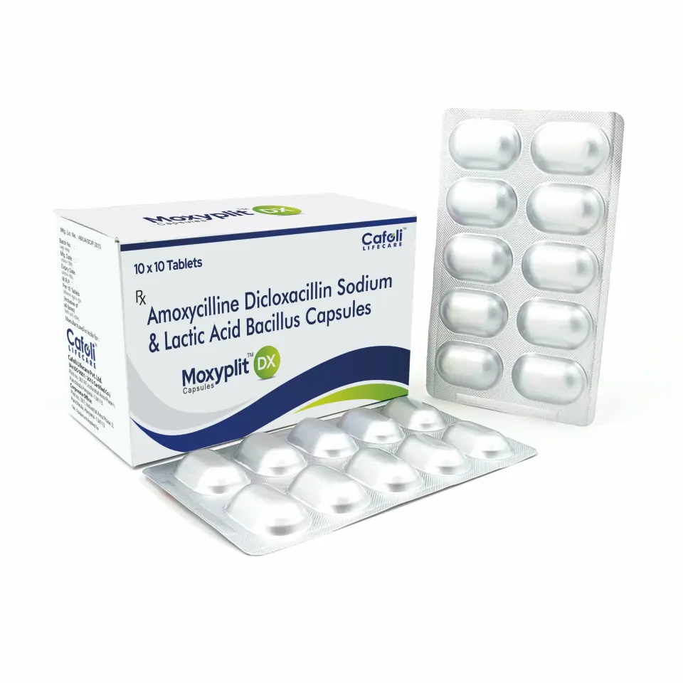 Moxyplit DX Capsule contains Amoxycillin 250 mg and Dicloxacillin 250 mg, a dual penicillin antibiotic combination designed to provide enhanced coverage against beta-lactamase–producing and susceptible bacterial strains. Amoxycillin offers broad-spectrum activity, while Dicloxacillin provides stability against penicillinase-producing organisms, ensuring effective bacterial eradication.